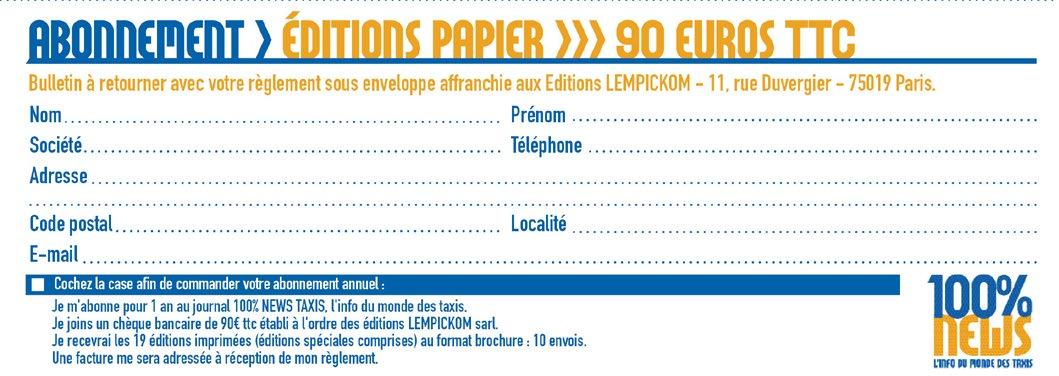 100% NEWS TAXIS, journal d’informations spécialisées disponible tous les 1ers et 15 de chaque mois. Edition digitale gratuite. Edition papier sur abonnement - LEMPICKOM sarl.