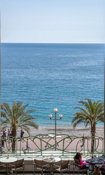 on se laisse séduire. Singularité du lieu, pour favoriser une immersion totale, téléphone et télévision ne sont pas présents dans les chambres. Enfin les vacances ! À quelques rues de l’hôtel se trouve la plage privée. Accueilli par un bleu infini, des meubles collectionnés, des bougainvilliers, le restaurant et des transats sur la plage de galets. Dans l’assiette : salade niçoise bien sûr, poivrons marinés, pissaladière, pan bagnat. Après ? On repart nager, on lit, on sirote un cocktail, mais surtout, on prend son temps. Le soir on se laisse envahir par la programmation cultivée de groupe live sur la plage comme cet été The Libertines, Parcels, Laurent Garnier, Breakbot & Irfane, Gilles Peterson qui feront danser la Promenade des Anglais !