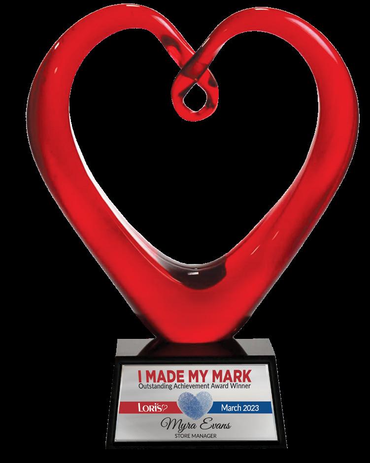 Each month a new Team Member receives recognition on our company website and on social media, along with the personalized Glass Heart Award statue, plus 2 extra PTO days, a local hotel stay, dinner, movie tickets and more. Winners have been surprised with a visit from Lori’s leaders, who personally delivered the awards and prizes.
