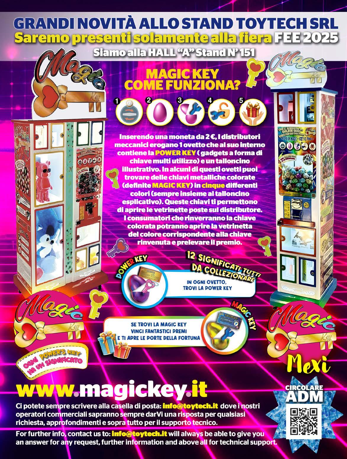 Magic Key ha trovato un notevole interesse da parte della clientela, e Magic Key Mexi l’ultima nata più compatta per spazi più contenuti, distributori automatico con concorso a premi (esente da nulla osta in quanto non rientrante nel T.U.L.P.S. 110) da la possibilità di vincere dei premi di valore in base al concorso, adatti ad un target di clientela molto ampio dal bimbo, ai teen-ager, ai genitori ed ai nonni , la Magic Key è stata presentata la primavera scorsa ed ha riscosso un attenzione davvero importante da parte degli addetti ai lavori ma soprattutto dal pubblico che ha premiato un lavoro certosino e complesso, ma semplice all’utilizzo e molto intuitiva per tutti.