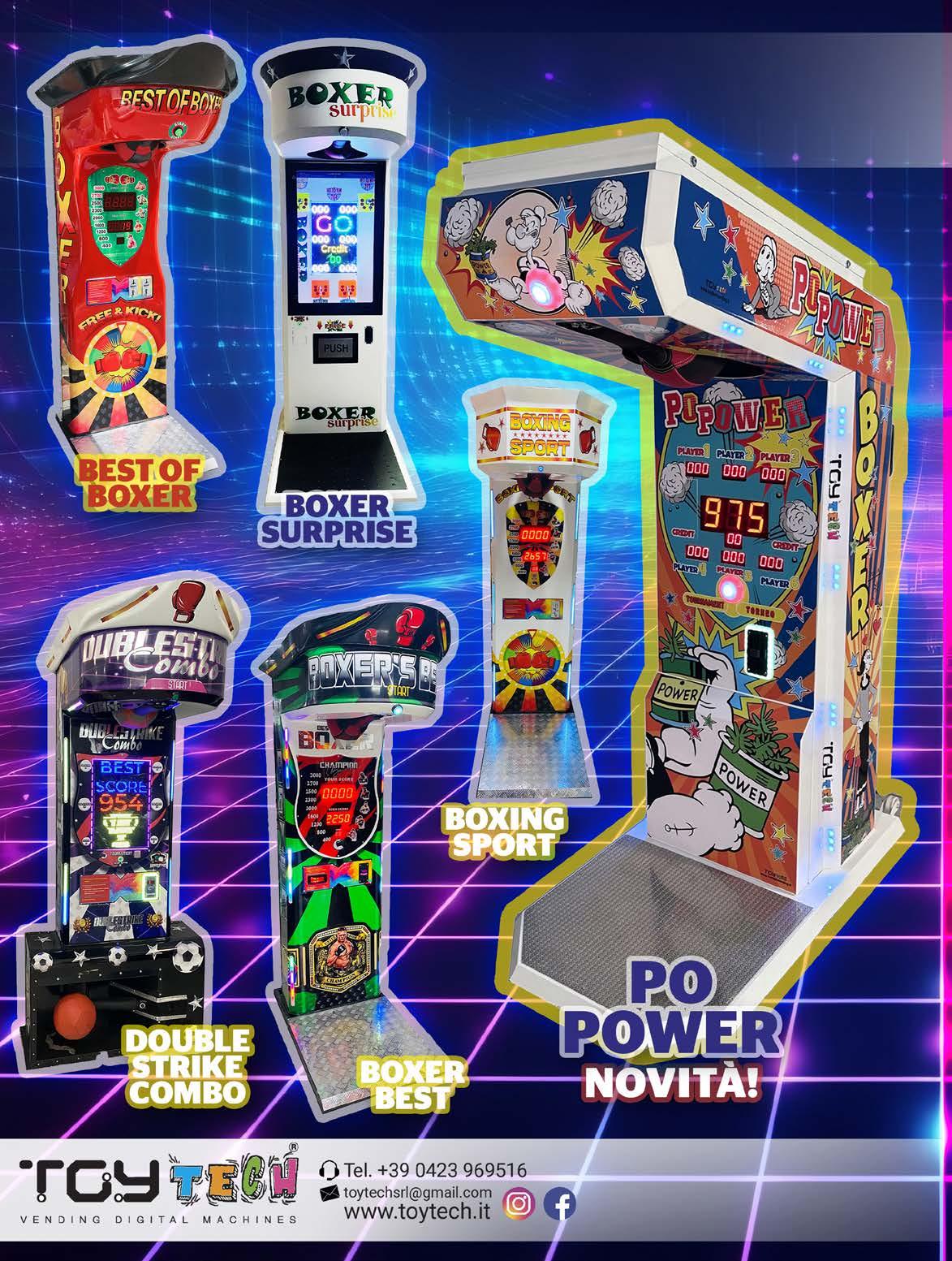 I Boxer della Toy-tech Srl sono stati progettati e costruiti con accuratezza, grande qualità ed attualità, con nuove tecnologie come tutti i prodotti Toy-tech S.r.l., fatti per durare negl’anni, il design accattivante attira l’attenzione inoltre i molteplici giochi inseriti nel display oltre al gioco intrinseco del pugnometro, danno una continuità negli incassi senza stancare il pubblico con un banale gioco oramai conosciuto da tempo.