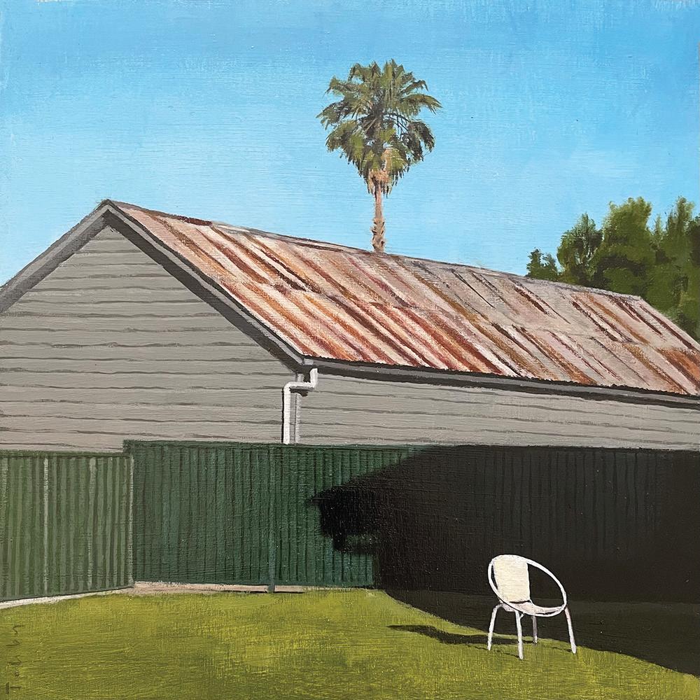 There is a quietude and stillness in Riddle’s chosen compositions, based on his photographic meanderings around town. In deciding on beginning an artwork, he asks, When should a photo become a painting? The answer may come by way of the quality of light captured or alternatively, an affection for the subject and its inherent poetic quality; a distillation of meaning in an otherwise ordinary subject.