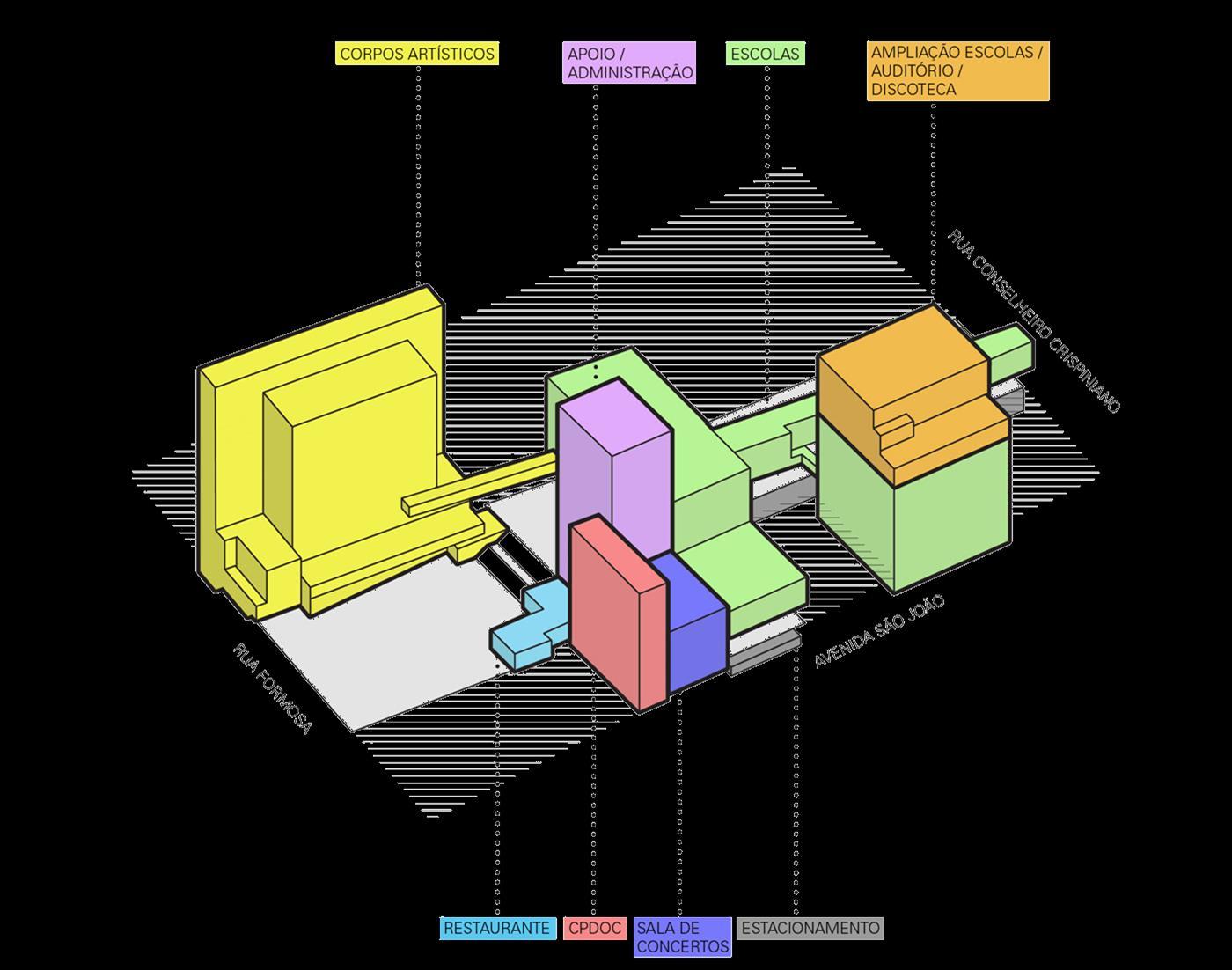 • Diagrama de Setorização: Indica, através das cores e legendas como a edificação é utilizada e como os setores se relacionam.