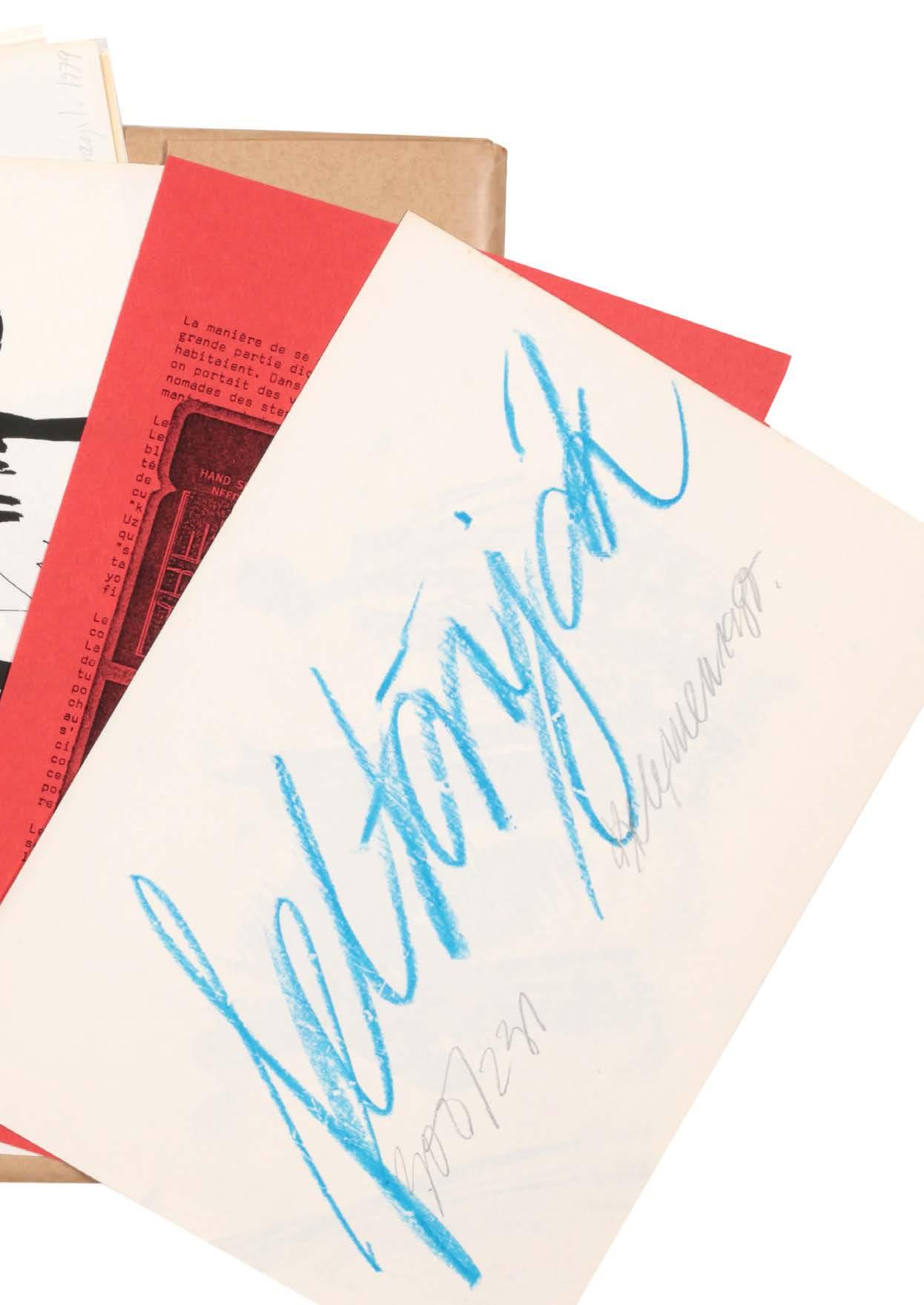 Edition of 300 signed and numbered copies. 54 contributions on loose sheets (mostly A4).
