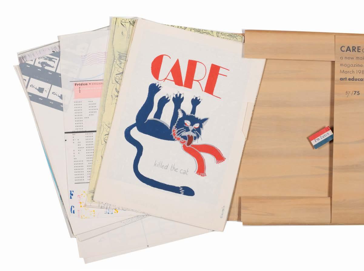 The first three issues were each editions of 75 copies. A wide-range of artists contributed various types of printed matter, from handmade collages, screenprints, objects, drawings, photocopies, foldouts, and other hard-to-classify pieces on various different sized and coloured papers. The first issue of CARE was themed Art Education, with more than 35 original contributions. CARE No. 2 was ‘size-free, subject free’ and for CARE No. 3 submissions required ‘a written or visual or touchable portrait of yourself doing your favourite art work’. Contributors were encouraged to publish further issues themselves, but the present three issues comprise a complete set as published by the Enschede Academy of Fine Arts.