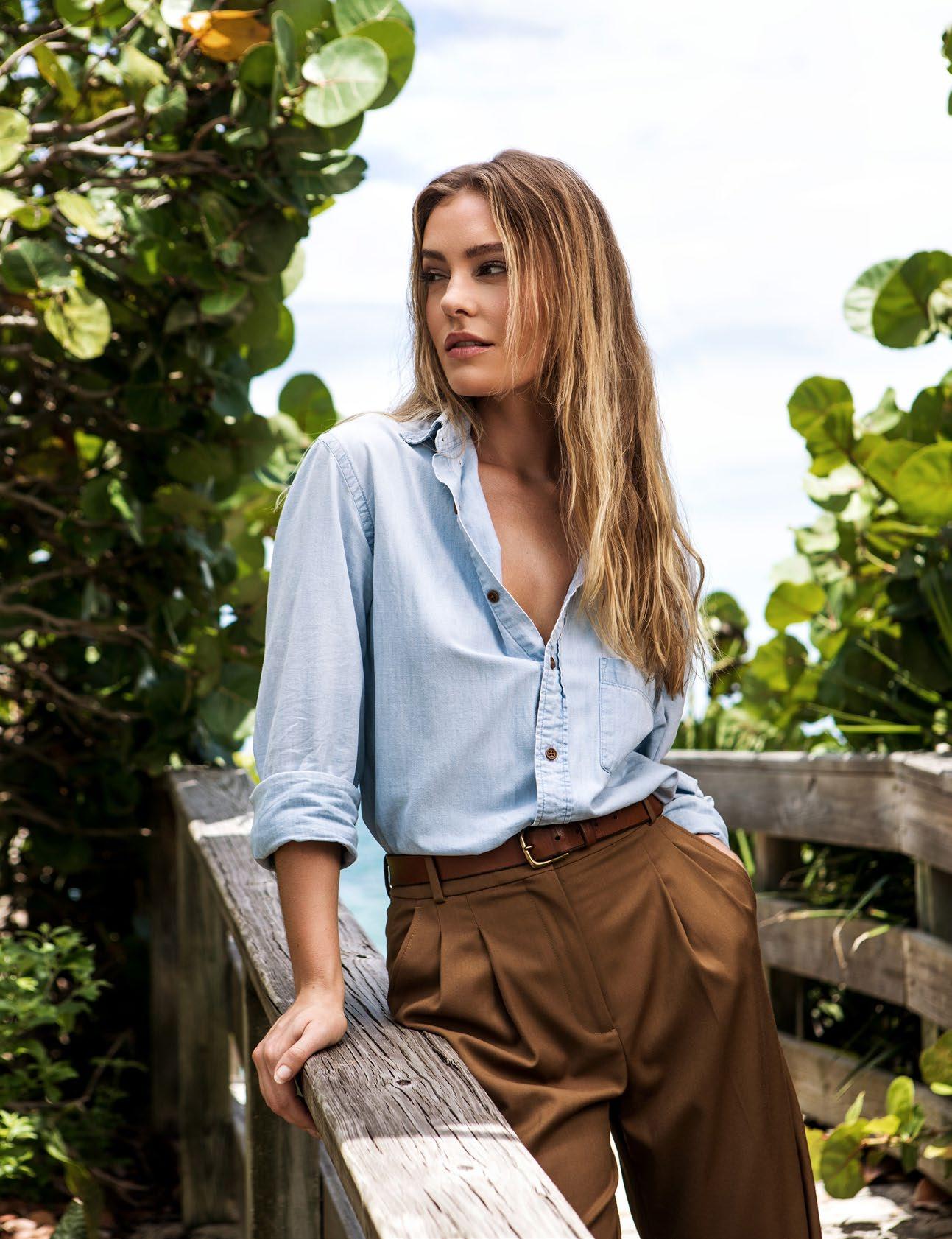 Brown Pants Massimo Dutti Chambray Denim & Belt Ralph Lauren pposite page White Swimsuit Monokini