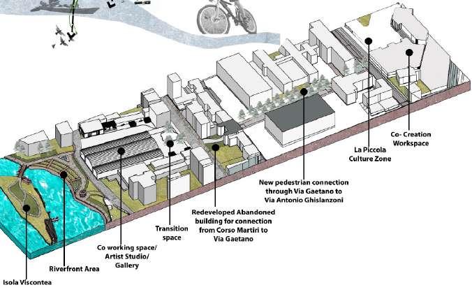 The target area encompasses the urban system along the axis connecting “La Piccola” area,Politecnico Di Milano Campus and the Viscontea Island as well as the urban systems along the waterfront. The project also focuses on the retrofitting of existing buildings to introduce activities that support the new connections and improve the quality of the spaces.