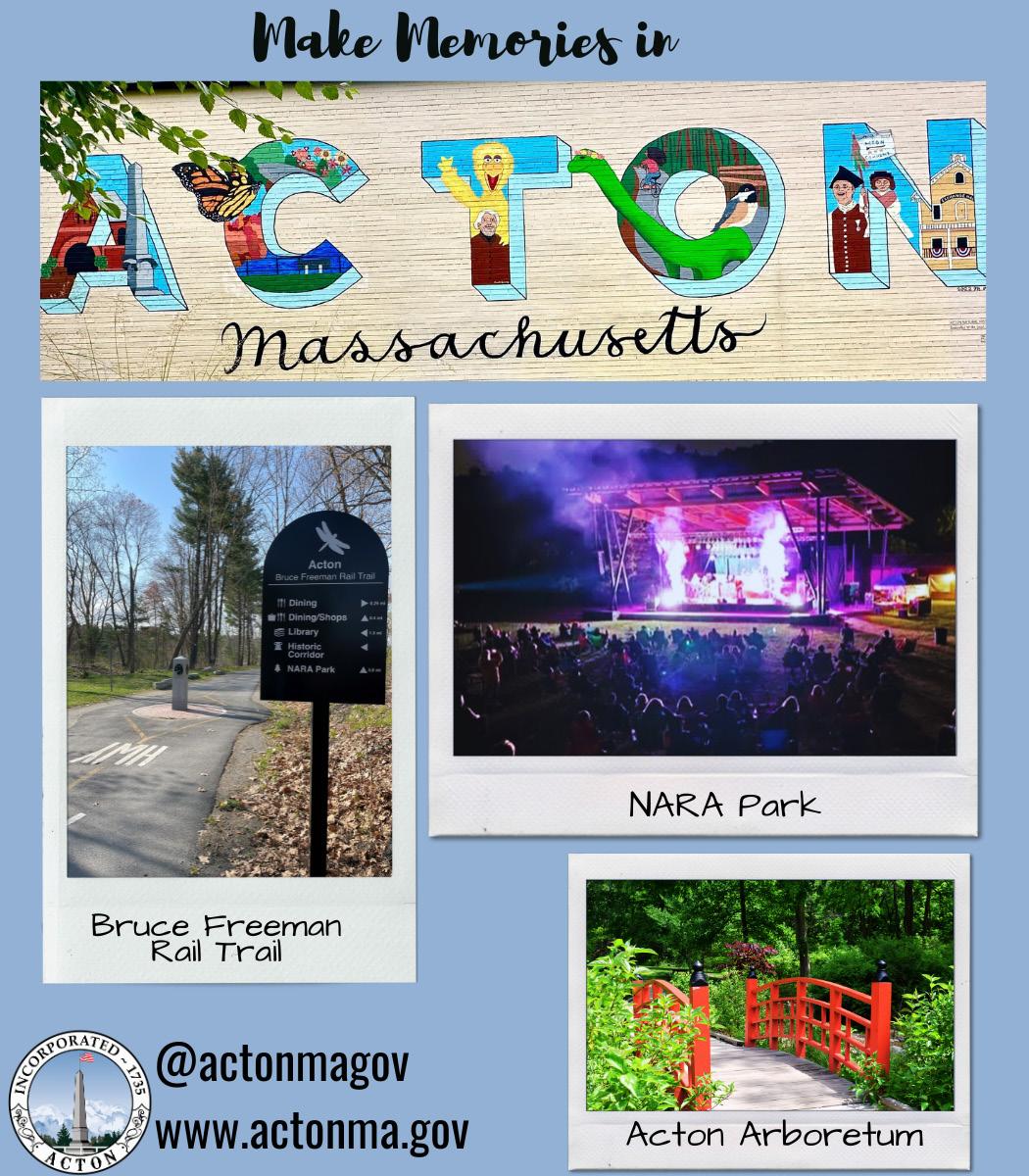 Acton is a vibrant suburban community located 25 miles northwest of Boston with direct MBTA train access. The Town has retained much of its traditional New England character, with historic architecture, stone walls, and tree-lined country roads. It is a diverse community & family-friendly destination known for its Town conservation areas and green spaces, two rail trails for active walking & biking including the 12+ mile Bruce Freeman Rail Trail that now connects Acton to our neighbors in historic Concord. Come visit the award-winning Acton Arboretum, many Town conservation lands, historic & cultural sites, the renowned Discovery Museum & community theaters. Acton hosts special events & festivals that attract visitors from across the area including seasonal concerts, cultural & sporting events & active recreation with a large outdoor amphitheater, gazebo, picnic pavilions, fields & swimming facilities located at NARA Park. Acton is also a regional shopping destination with local retail shops & services, boutiques, cafes & dining, an independent bookstore, the AB Farmers Market & more! actonma.gov