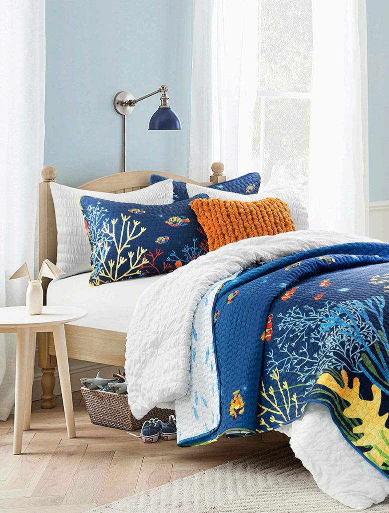 a A Block Print Floral Quilt Set, Blue-White B Coastal Chic Scallop Edge Quilt Set, Blue C Jacquard Diamond Comforter Set, White D HG Navy Linen Euro Pillow, Navy E Tufted Diagonal Decorative Pillow Cover, White