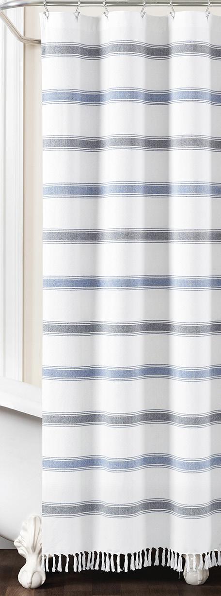 A Herringbone Stripe Yarn Dyed Blanket/Coverlet, Black-Multi B Ava Diamond Oversized Cotton Quilt Set, Mustard C Sherpa Tassel Fringe Throw (Featured in White) Colors Blush, Gray, Ivory, Navy, Neutral D Boho Tassel Stripe Shower Curtain, Gray-White