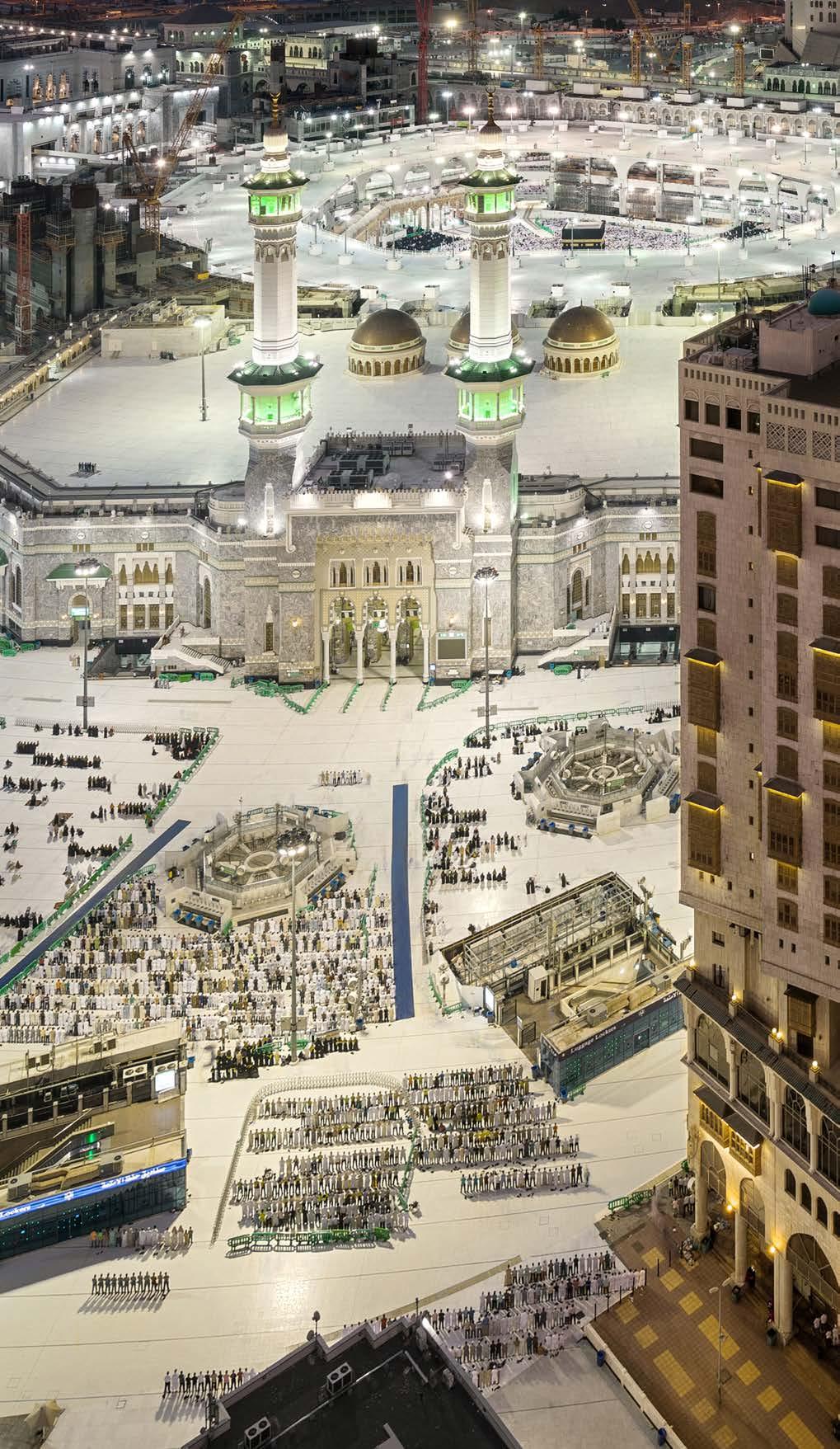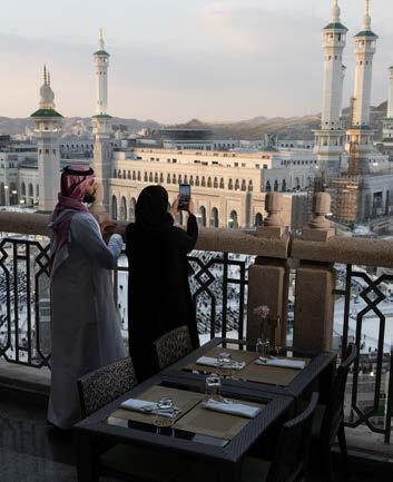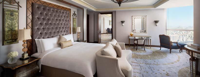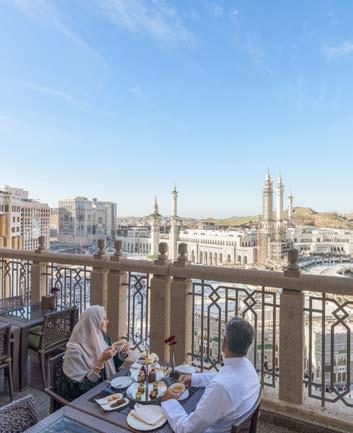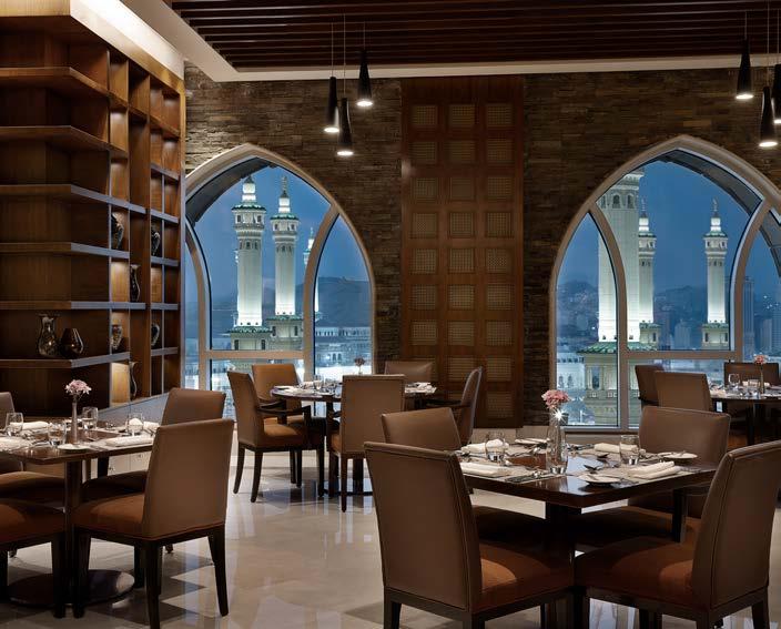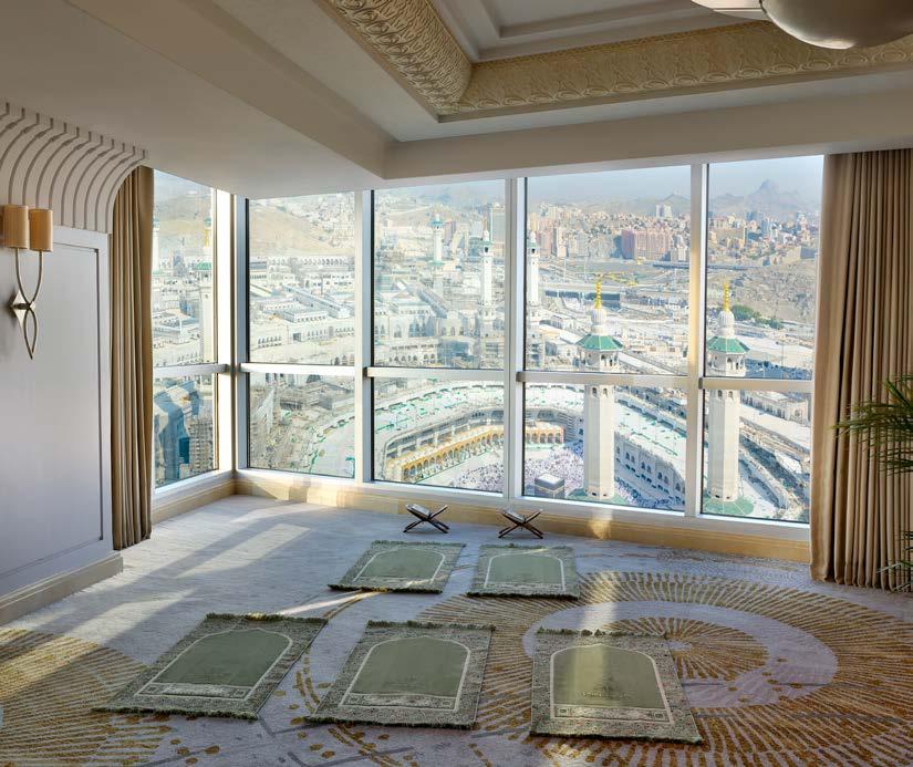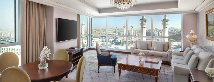 the Kaaba. Many of its rooms and VIP suites include separate living and dining areas, kitchenettes, and elegant marble bathrooms, allowing families and groups to stay together in privacy and peace. The panoramic glass lifts reveal a majestic perspective of the Holy City, reminding guests of the privilege of being so near to its heart.