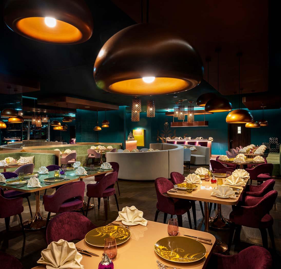 equal measure. The ambience is refined, with hues of green and copper under dimmed lighting, accompanied by gentle lounge music that sets the mood for sophisticated dining. The menu, crafted with inspiration from India’s vast regional diversity, is both familiar and daring — from comforting classics to progressive reinterpretations