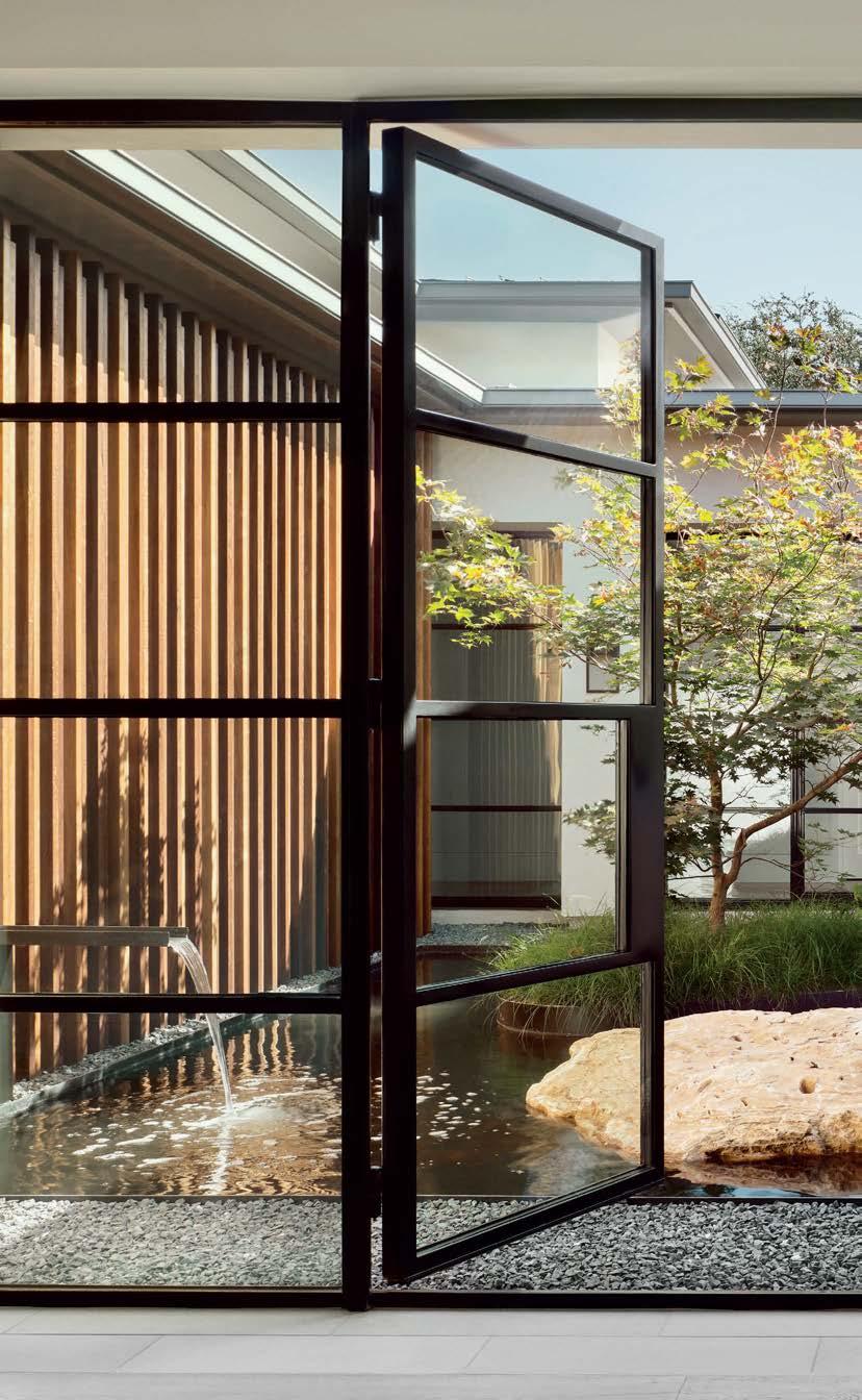 The homeowners wanted to turn the interior courtyard into an inspiring retreat made of natural elements, such as a Japanese maple and an onyx boulder. The sculptural tree carving by the door brings that organic spirit inside.