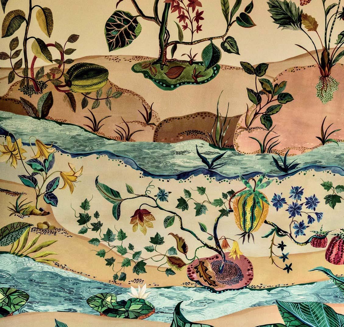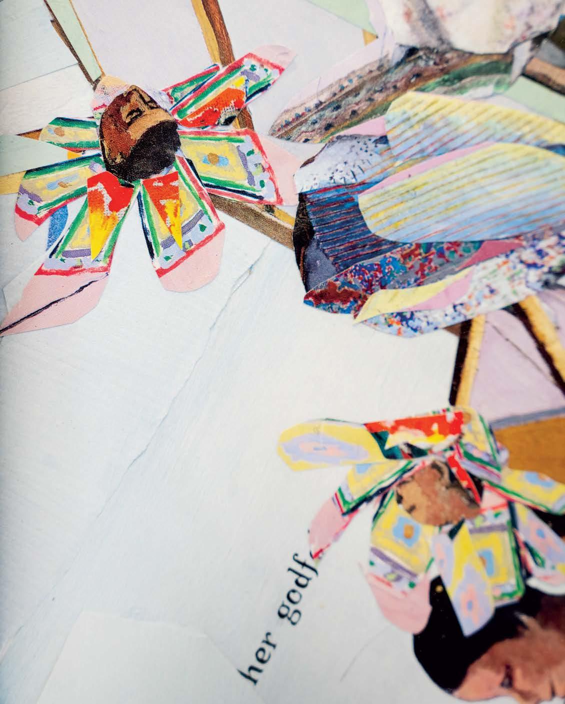 samples. “It’s a great sustainable source because there are constantly designs that are being retired,” she says of the latter. She pulls her materials according to color before spreading them around her in a whirlwind of scraps, then manipulates the paper by cutting, ripping, rubbing and even crumpling it to create different textural qualities. “I find that every collage needs to have some tearing in it, because when you tear paper, it softens the transition from piece to piece,” she describes.