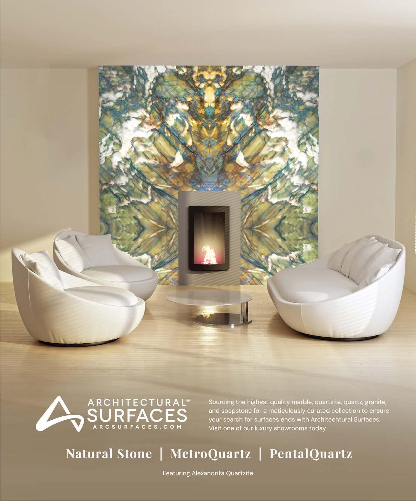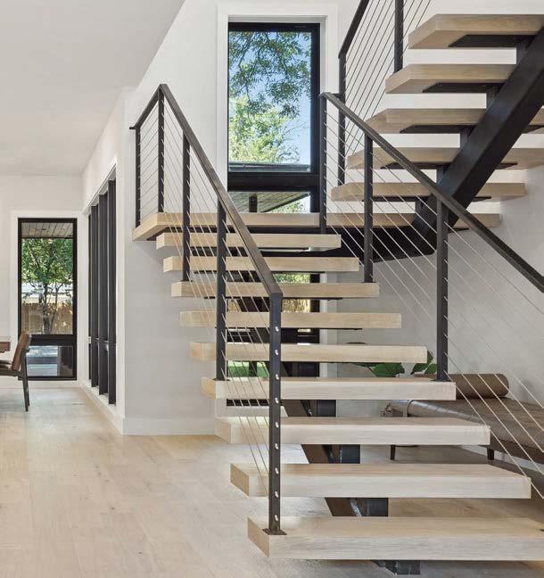 entrance and the cantilevered staircase with floating treads. The meticulous grid of stonework also flows seamlessly. “From inside to outside, around windows, doors, fireplaces and wall heights, there’s no odd shape or cut,” Calhoun says.