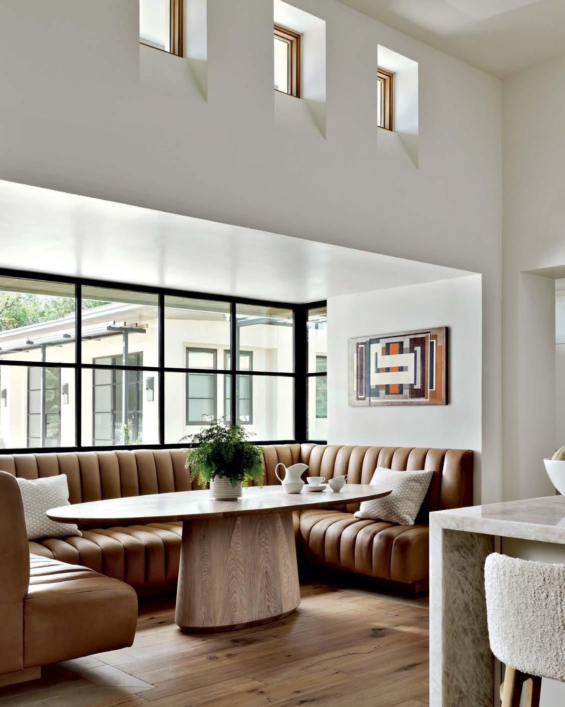 Opposite: Defining the breakfast nook, a banquette made by Briley’s Upholstery Shop features leather sourced from Canvas Showroom, its tufting echoing the fluted plaster details in the kitchen and family room. Edwood Studio designed the oval white oak pedestal table.