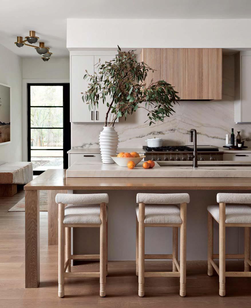 Zinnecker carried the living room’s neutral palette into the dining area, where she turned a fireplace wall into a marble-lined niche fitted with a walnut buffet. The result: convenient drawers for table linens and entertaining essentials, as well as a sleek display space. “There wasn’t a ton of storage in this house, so we made the most of each area—I used every little trick I have,” the designer shares. In the adjoining kitchen, she took a sophisticated but utilitarian approach, wrapping the walls with oak and topping the counters with quartz, both durable materials.
