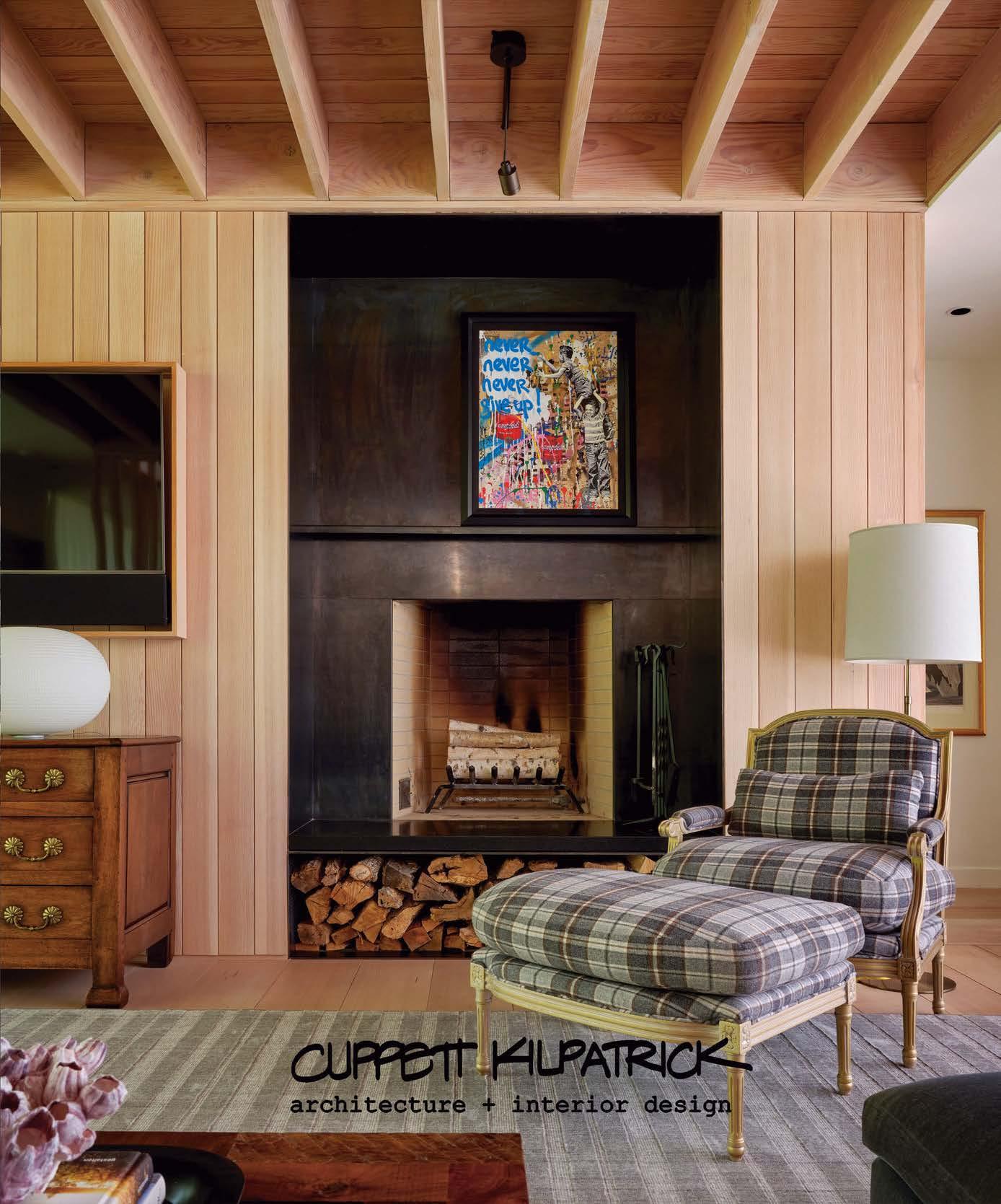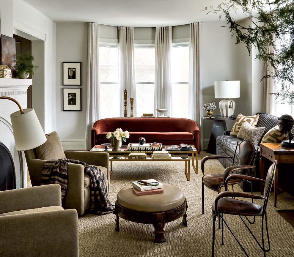 A custom curved sofa and petrified-wood coffee table designed by Claire Zinnecker and fabricated by Petrified Design emphasize the space’s vintage but family-friendly feel.