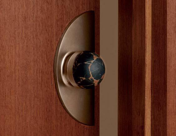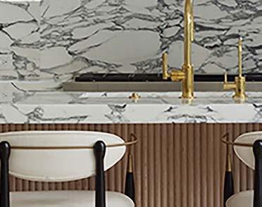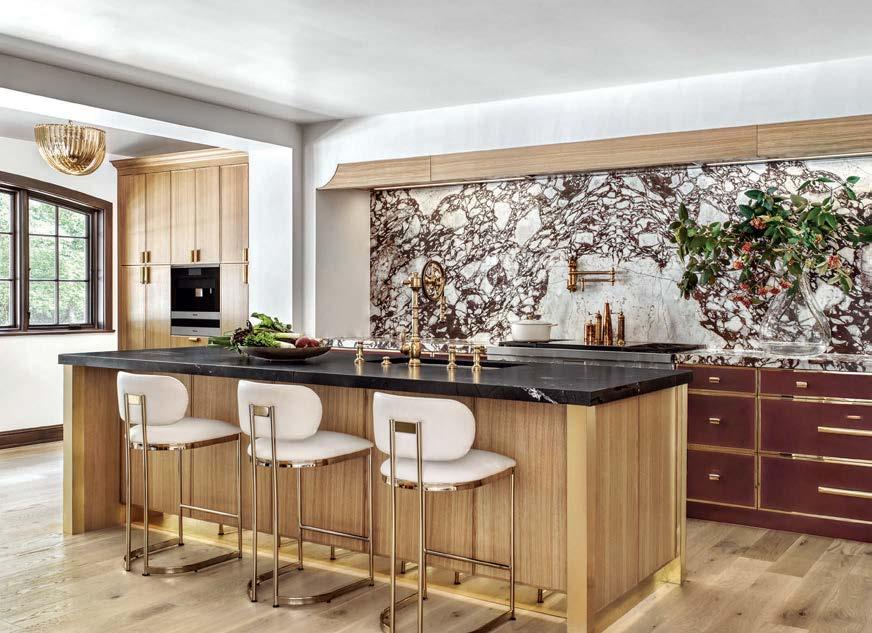 The entertaining areas needed to be flexible in size and function, so the formal living and dining space connects to the salon and bar via two sliding oak doors on either side of the fireplace. “If the clients want to, they can close this room off to make the space more intimate during parties,” Flanigan explains. The bar features moments of quiet glamour: herringbone floors, shelving backed by smoked-glass tiles and a large C-shaped countertop of deep blue marble with black veining. In the kitchen, open brass shelving nods to the brass pothanging accent on the custom hood, while detailing underneath the waterfall edge on the large central island introduces organic curves.