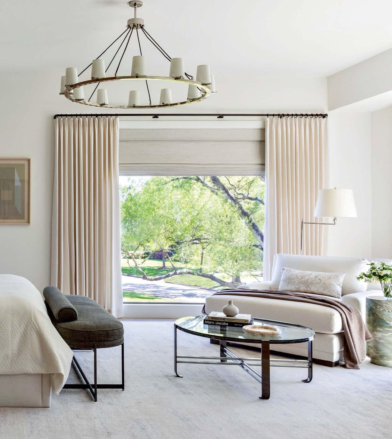 Painted Benjamin Moore’s Cloud White, the primary bedroom enjoys serene views of the frontyard trees framed by drapes in a Manuel Canovas textile. The Lee Industries chaise, upholstered in a Rogers & Goffigon fabric, has become a favorite reading spot.
