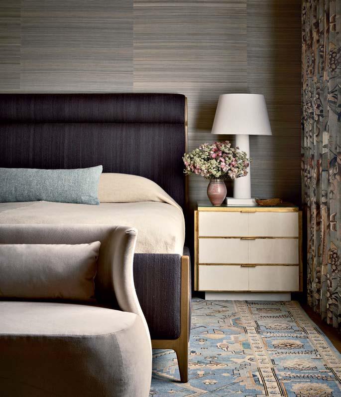 Left: Lush textures swathe the primary bedroom, featuring Phillip Jeffries’ Alexander the Grey wallcovering. A Kimberly Denman chair wrapped in Liaigre fabric cozies up to an Alfonso Marina dresser and John Pomp lamp from The Bright Group.