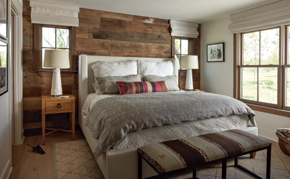 Upstairs, at the top of the voluptuous new stairway, sits the ultimate parental hideaway. The room’s long, rectangular shape necessitated some design savvy from Zinnecker and Randolph. By placing the bed at the far end of the room, overlooking the lake, they accommodated a television nook on the opposite side. “The husband is a movie fan, so we wanted to make a really beautiful space with hidden speakers,” Zinnecker shares. The team lined the room with built-in cabinetry and added a vanity. “It feels like a hotel suite,” she says.