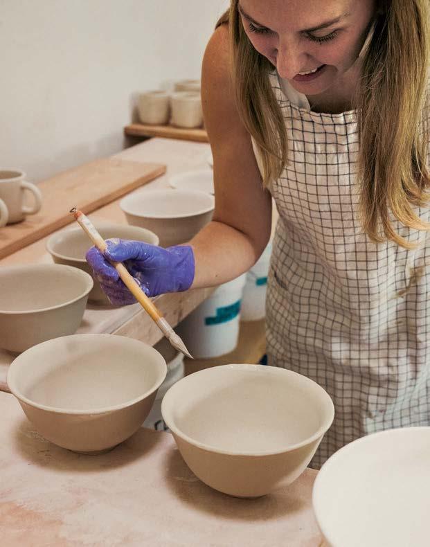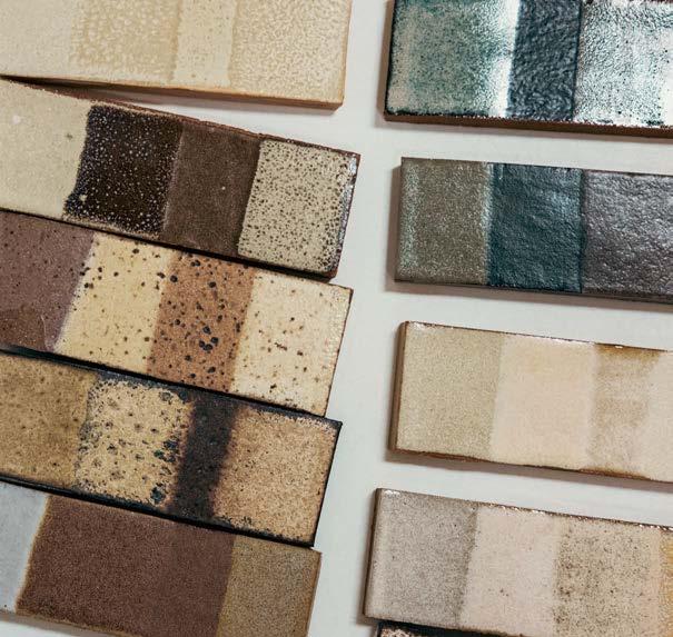 An Era Ceramics bud vase in the Grotto finish (opposite) demonstrates how glaze and clay can create a natural kaleidoscope of earthy tones. Ceramicist Lindsey Wohlgemuth applies glaze to bowls in her studio (left). She makes multiple color samples on tiles (above) before applying the chosen hues to thrown pieces such as dinnerware (top).