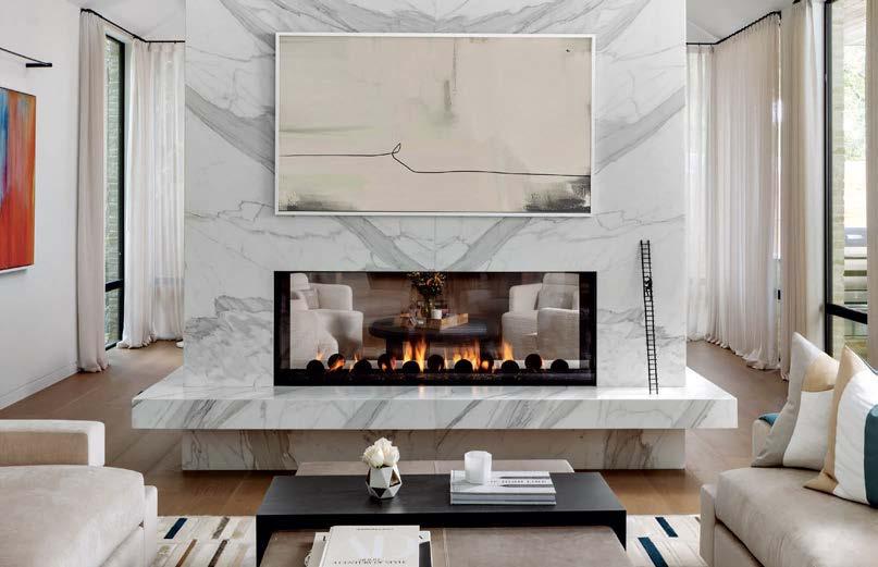 The clients had first worked with an out-ofstate architect, but the resulting design was too conceptual and modern for their tastes and felt out of place in the more traditional neighborhood. So, the couple brought in builder Scott Frankel, who had worked on a number of Tanglewood homes, to refine the original plan. Now, the exterior is clean and transitional with contemporary elements, and the gabled roof and stucco finish bring a sense of softness that helps the dwelling blend in with its neighbors. This is no museum, so the interior was envisioned as a warm, comfortable backdrop for the art it showcases. “The house is very inviting. They are raising their children there, after all,” Frankel observes. The designers did a comprehensive art walk with the couple, prioritizing the placement of works by artists such as Donald Martiny, Jennifer Gibbs and Martin Coronel Ordiales before deciding on furniture. A lithograph of Picasso’s Buste de Femme au Chapeau Bleu, for instance, oversees daily life from a prominent position above a game table in the salon. “The client wanted the Picasso to be in a primary entertaining space so he could see it every day,” Frankel shares.