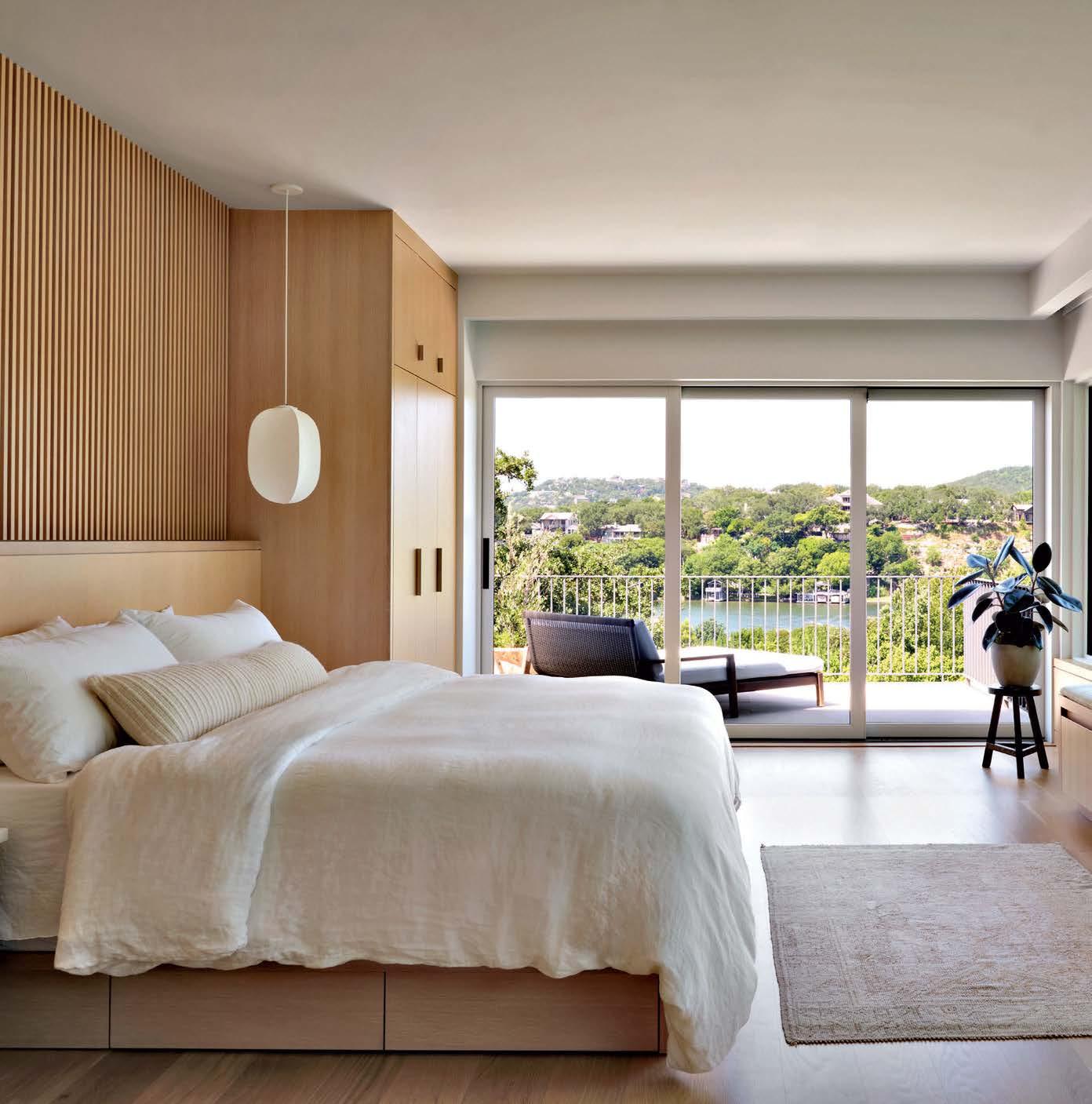 Left: To ensure the space feels peaceful, the homeowners’ bed was oriented to get a prime view of the lake. Along the window, an upholstered bench doubles as an ideal reading spot and hidden shoe storage. RH’s Mesa Teak daybed on the balcony invites lounging.