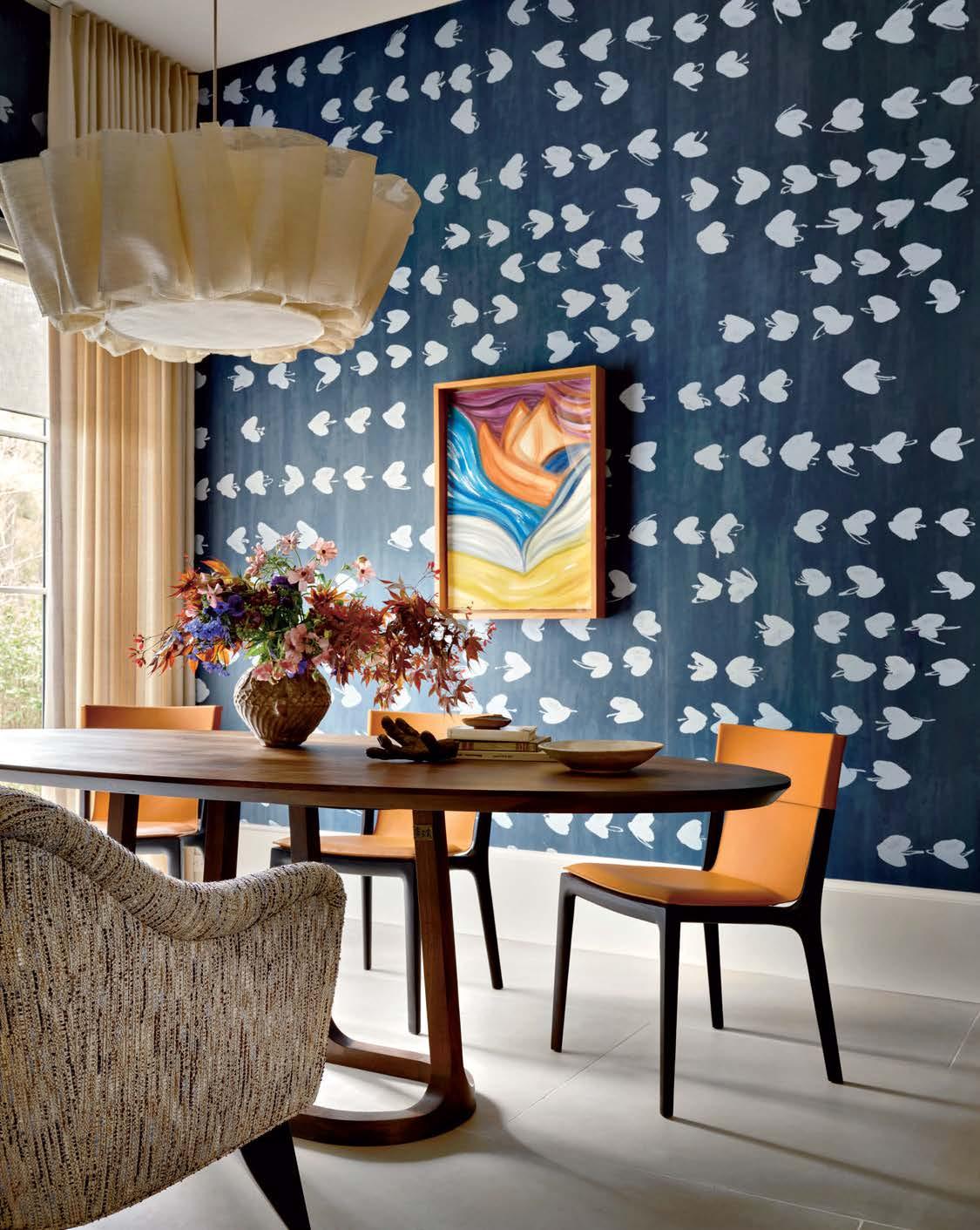 rich blues of the breakfast room’s Porter Teleo wallpaper complement a Marina Perez Simão painting. A Mark Jupiter table, Poltrona Frau chairs and a Nobilis-covered banquette sit underneath a Pinch pendant.