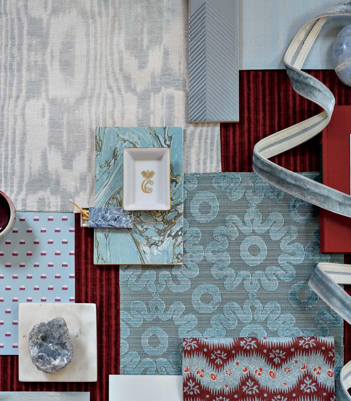 Layered mood boards by stylist and photographer Robin Verrier feature trending color combinations alongside the newest fabrics, wallpapers, trims and tiles.