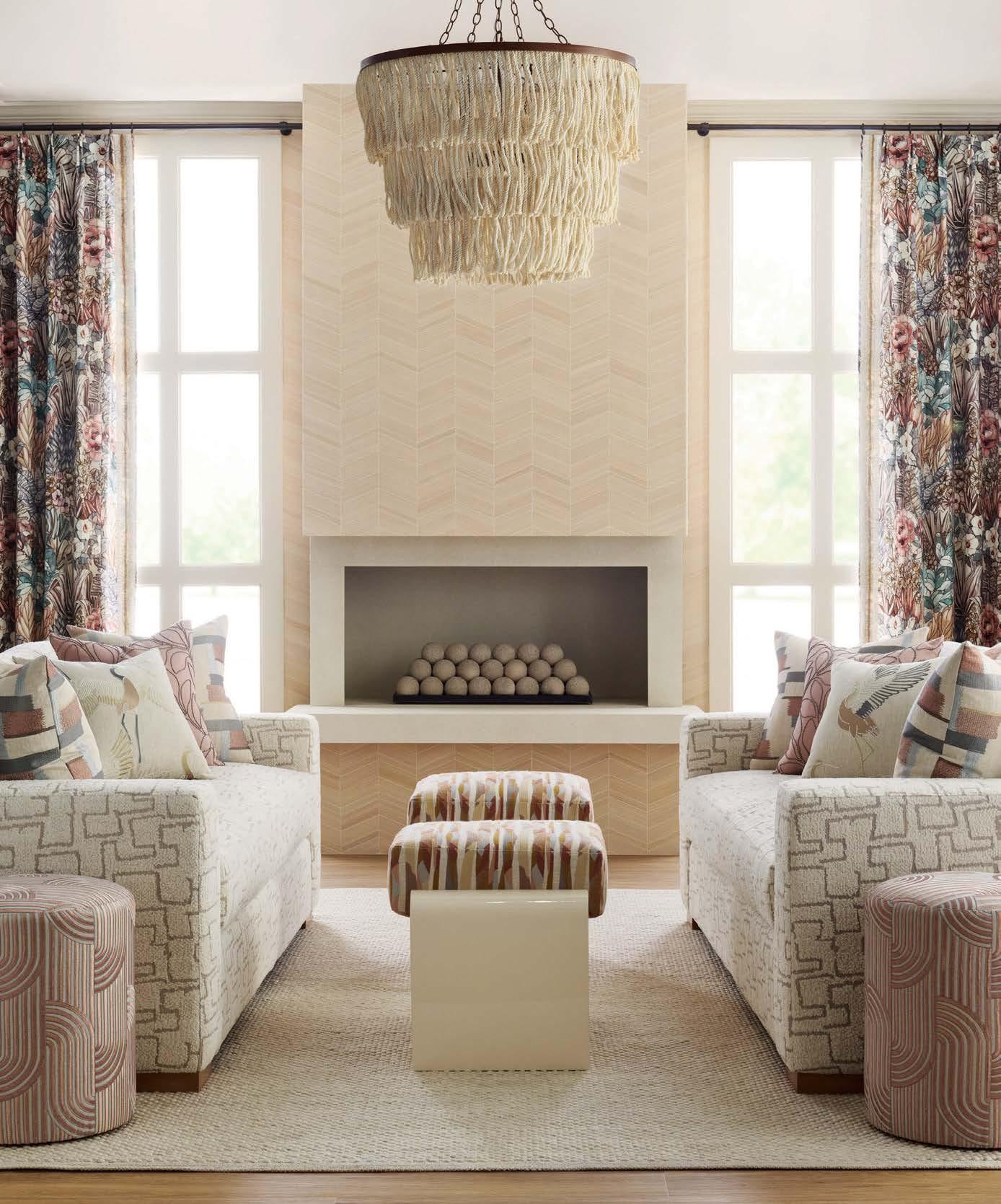 Upstairs are the bedrooms and a casual family room where the owners pile onto the sectional to watch TV together. In the primary suite, the clients dreamed of a serene retreat. A seating area and a bed with a custom headboard and built-in floating nightstands make the room feel tranquil and refined. The neutral color scheme encourages occupants to focus on the large windows, framed by linen panels. “They wanted to be able to see out toward the front of the house—the view of the trees was incredibly important to them,” Fitzgerald explains.