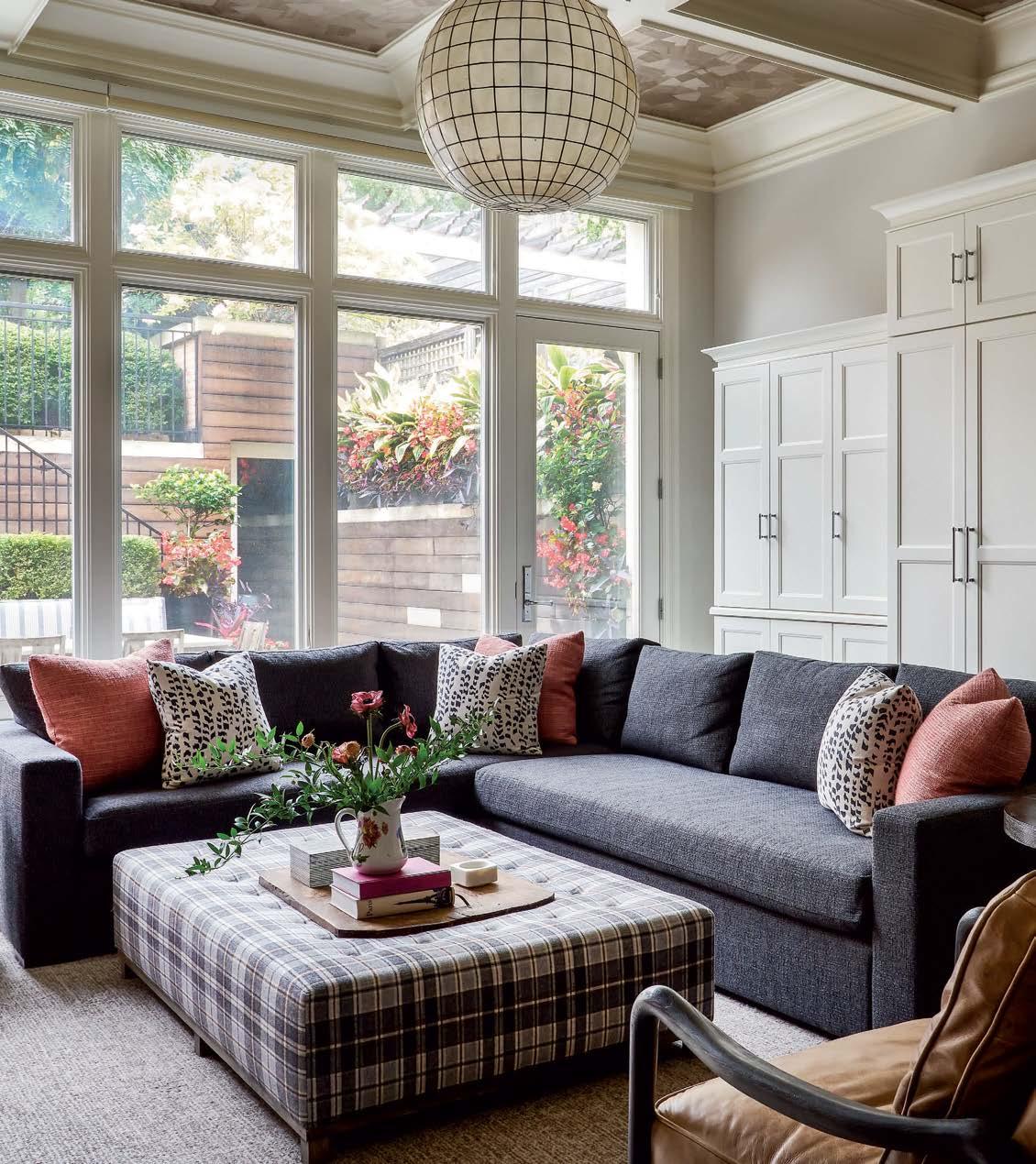 Above: In the family room, designers Dan Rak and Emily Samano created an indulgent space for lounging with a sectional made by Urban Craft Custom Upholstery and a Verellen ottoman in a Pindler tartan. Covering the ceiling is a geometric wood-veneer wallpaper by Innovations.