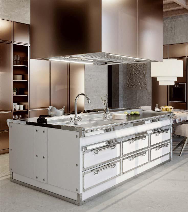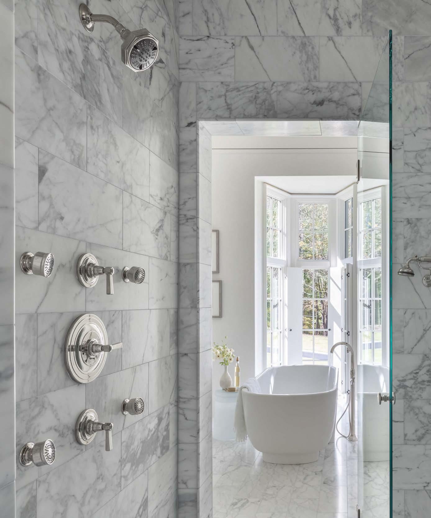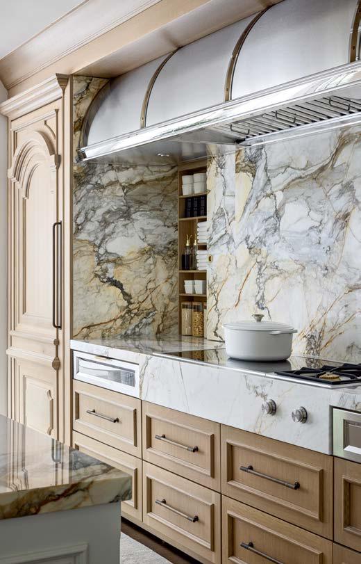 Bottom right The mixed veining of Calacatta Macchia Vecchia Extra, fabricated by Carthage Stoneworks, ties in the different elements incorporated into this kitchen.