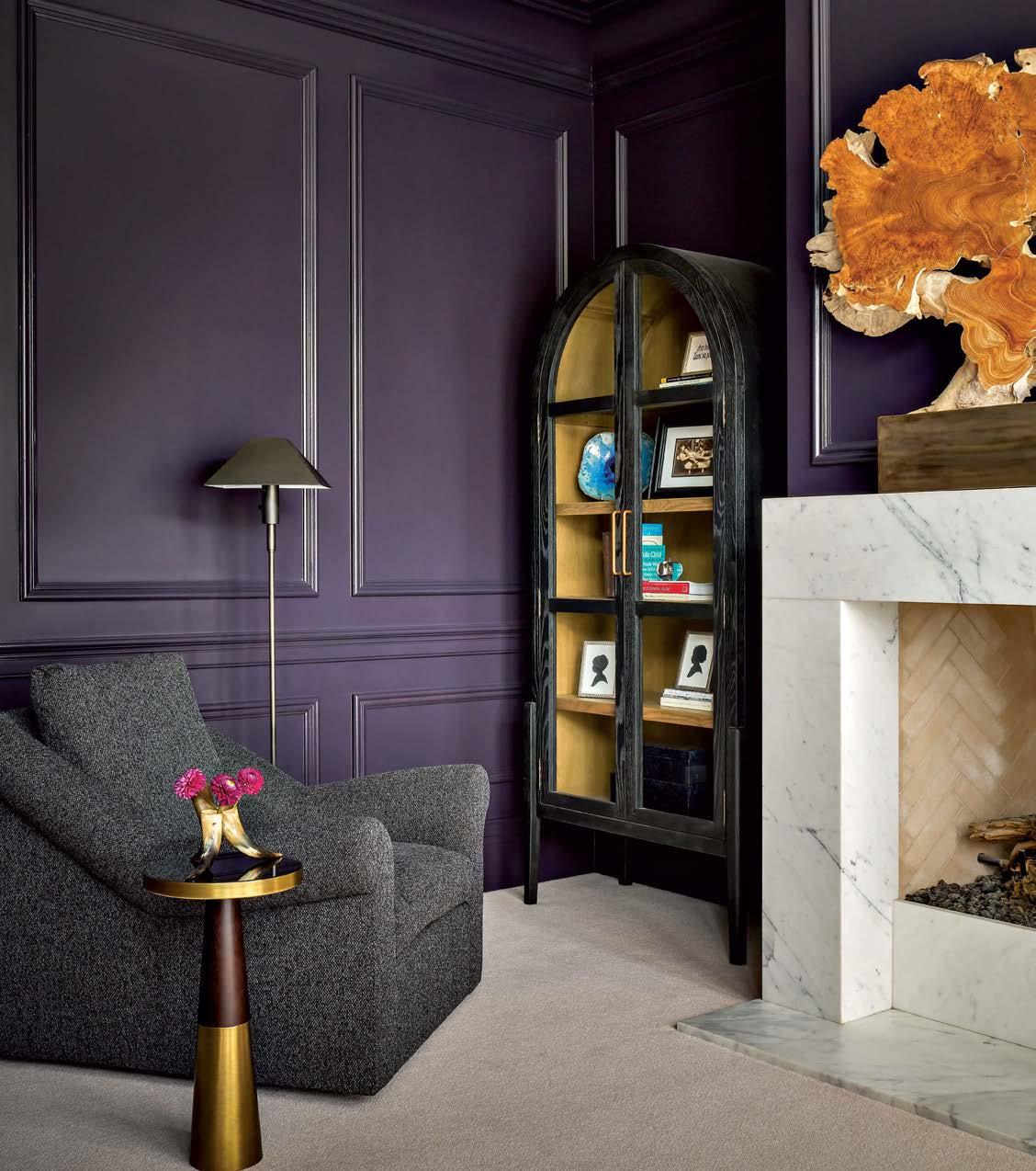 Above: In the primary bedroom, Benjamin Moore’s Tulsa Twilight is highlighted by golden accents, such as the brass base of the Uttermost table and the sculpture above the fireplace. James Dunlop Textiles bouclé on the Ambella Home Collection chair adds warmth.
