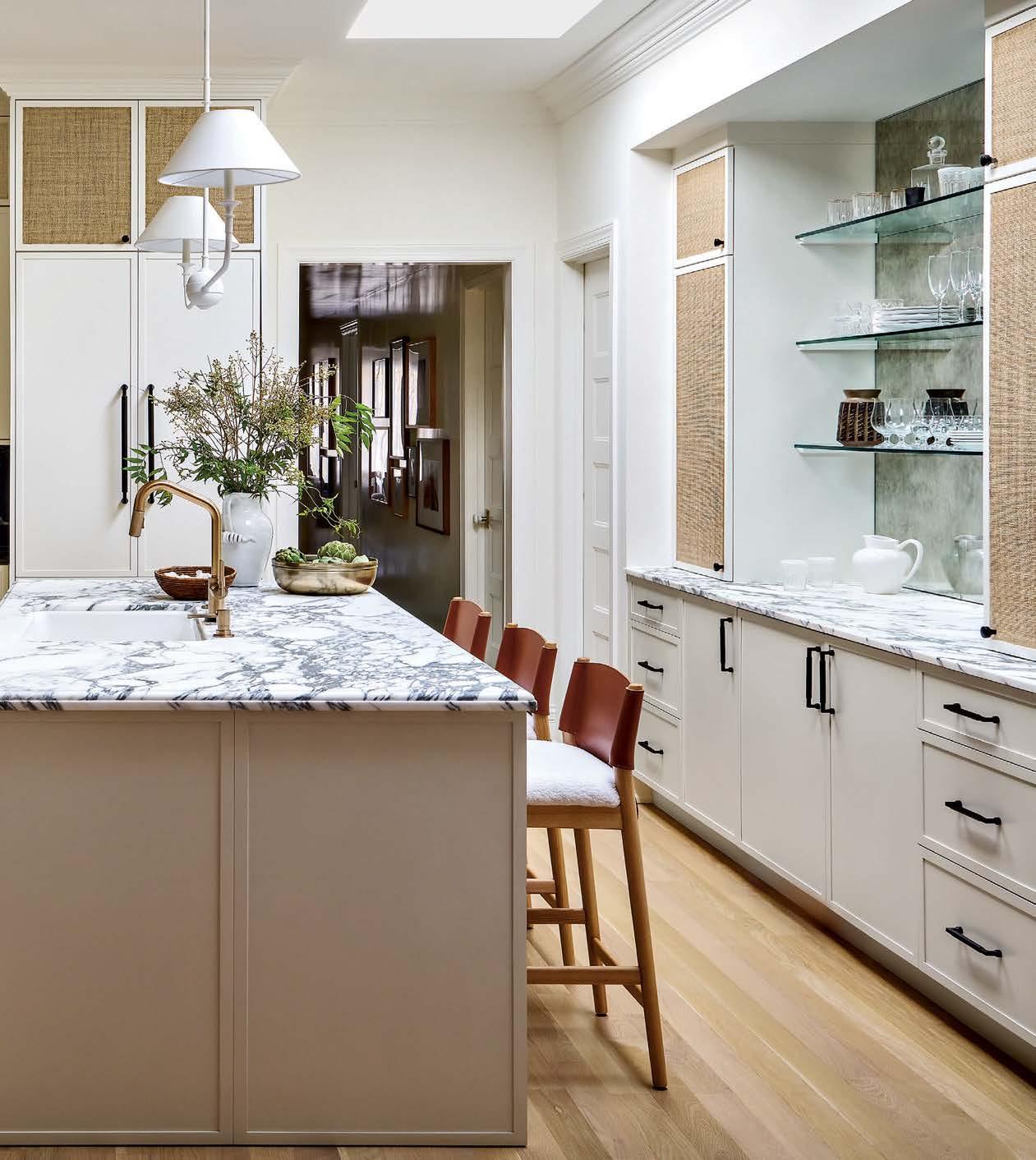 Infused with sunshine courtesy of a skylight, the kitchen’s mix of elements—from the modern, cleanlined cabinets inset with grass-cloth panels to the antique glass behind the bar—exemplifies Walder’s approach. “It doesn’t feel shiny and new,” the designer says, pointing to the contrasting natural marbles and the deep crown molding. “It appears modern at first glance, but when you look closer, you see details that feel a little more historic.”