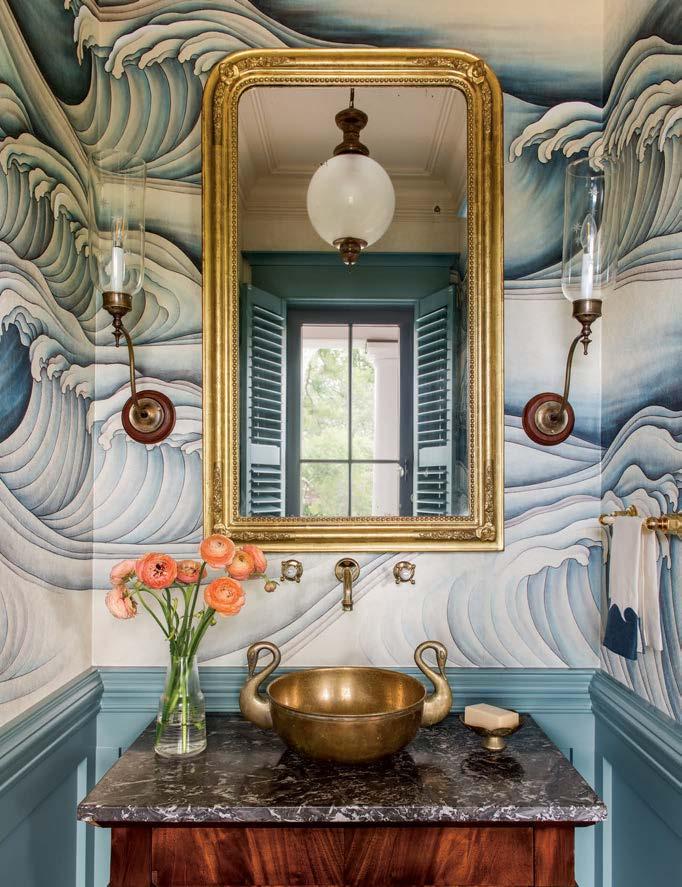 suggestions to her husband with a material palette that emphasized woods and natural marbles to create a textured backdrop for the antique and vintage furnishings the pair had collected individually and together over the years. “It was really nice being London’s client,” Bradley says. “She’d present maybe three or four boards to me, and it was always fun. We picked the same board 90% of the time.”