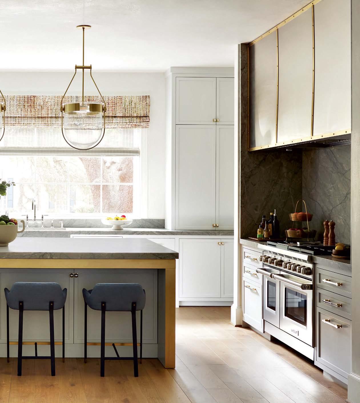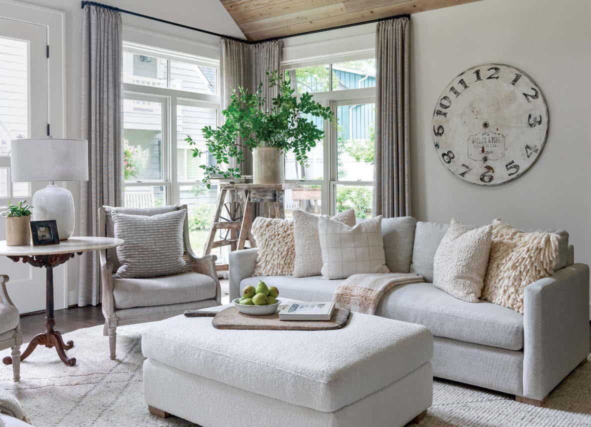 Guided by builder Jim Strange’s talented team of artisans, creamy white millwork sculpts the interior, from the dining room’s wainscoting and coffered ceilings to the custom-cut trim framing the rounded archways and paned windows. Underneath this eloquent molding lies concealed messages and prayers scrawled by loved ones during a genderreveal party that took place while construction was still underway. “That was the first time we hosted our friends and family at the house,” the husband recalls. “It became the celebration of all we hoped the home could be.”