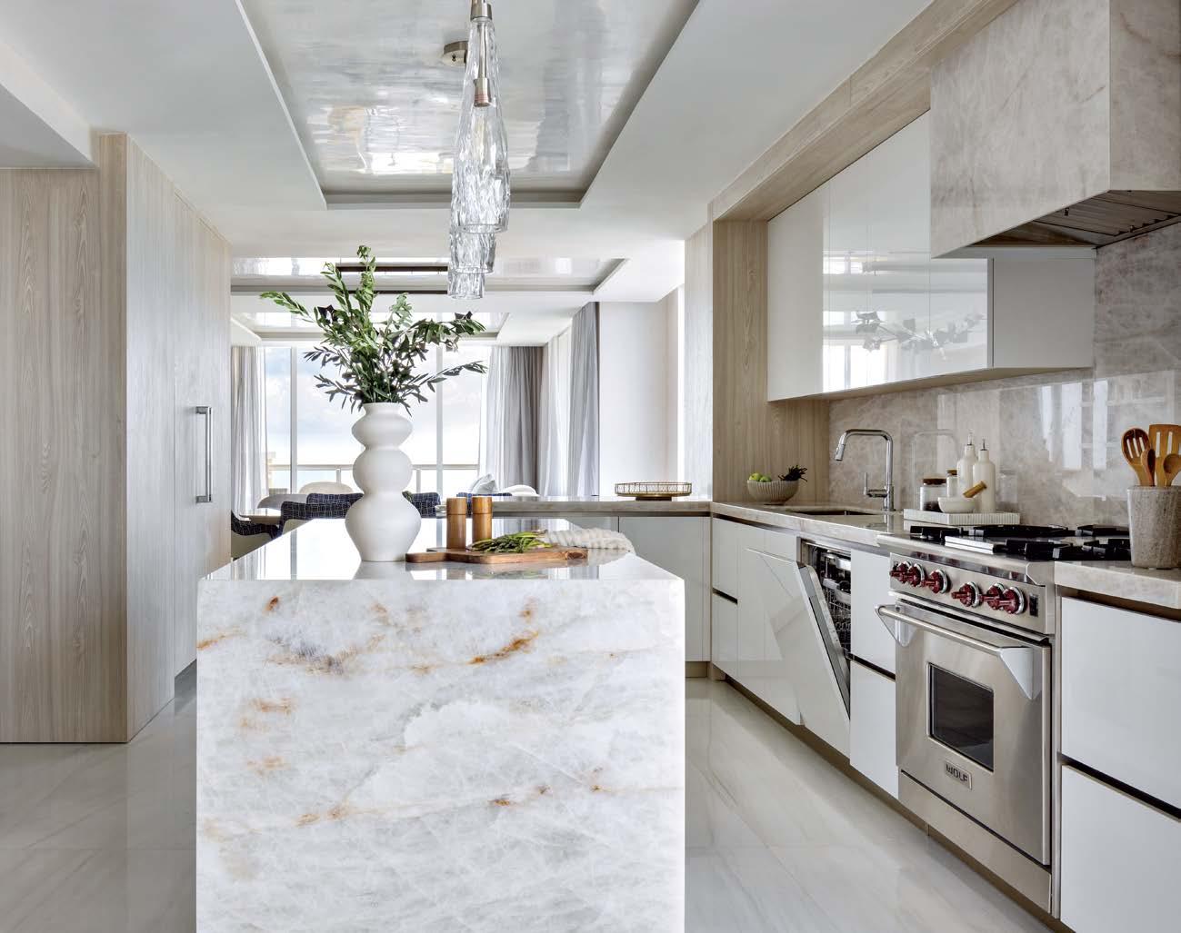 Top This modern kitchen design features Taj Mahal quartzite countertops, floors and a full-height accent wall. Bottom Meticulously fabricated and installed by Armina, the Jade marble at the Circle Bar is the centerpiece of the luxury renovation at Nemacolin.