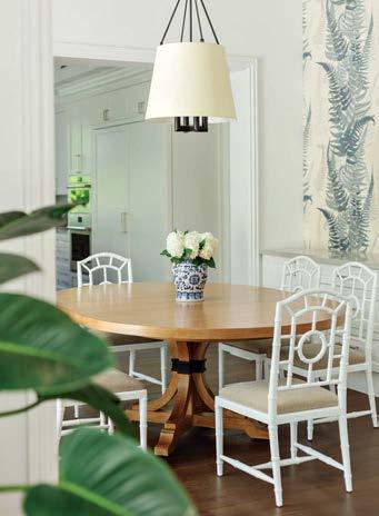 Above: CW Stockwell’s Martinique wallcovering swathes the dining nook, while the brand’s indooroutdoor Cabana Sunbrella fabric covers the banquette cushions. A Currey & Company chandelier floats above Serena & Lily’s Southampton dining table, which rests on original terrazzo flooring.