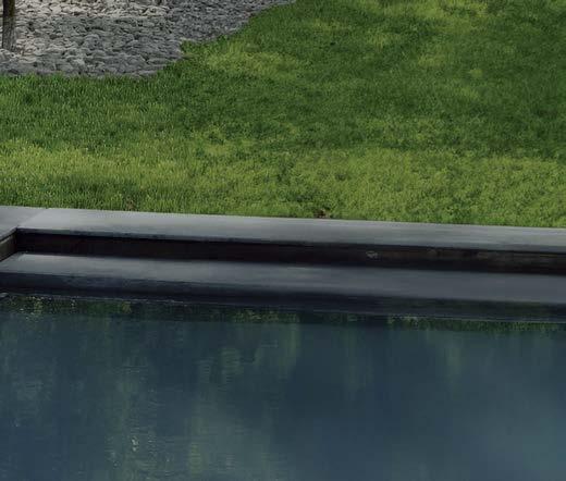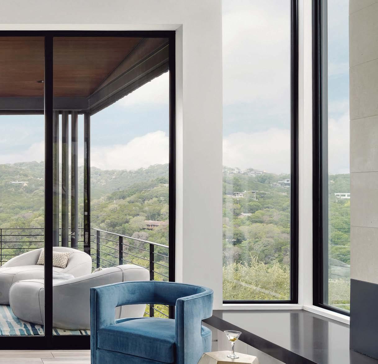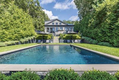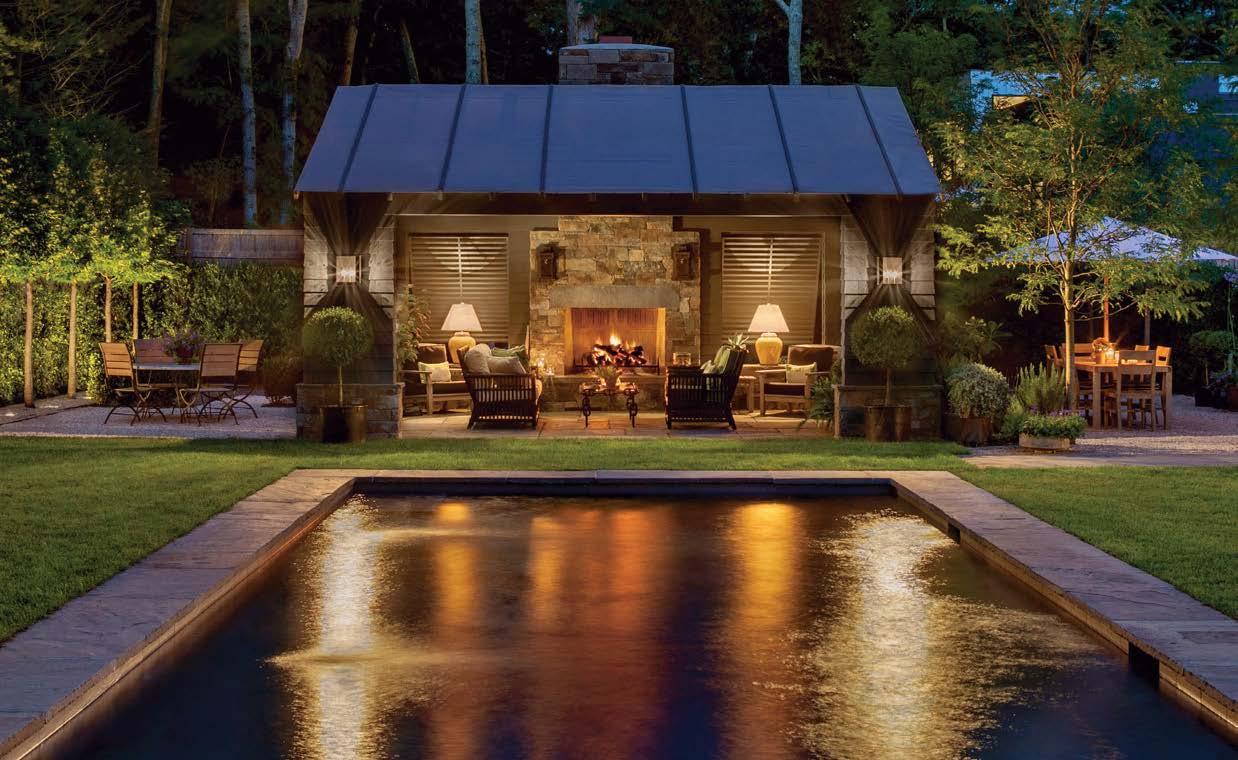 Linked by a sit-down, pass-through bar, the garden room is an exceptionally festive setting for entertaining. First conceived as a covered porch, it was ultimately glassed in with oversize, thinframed windows so as to be usable year-round. “It has all the comforts of an interior space while feeling immersed in the outdoors,” Finlay shares. “The landscape serves as the walls.”