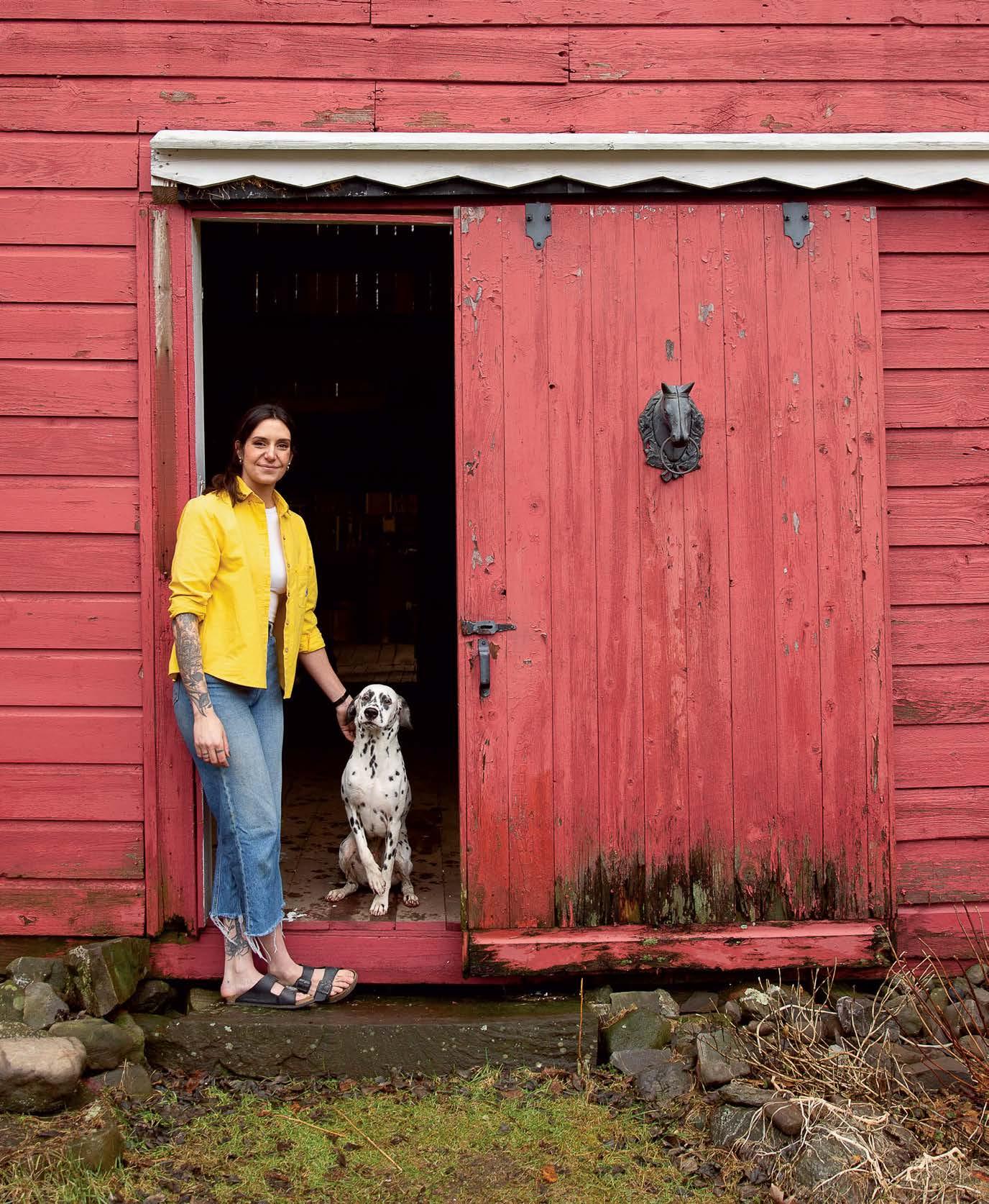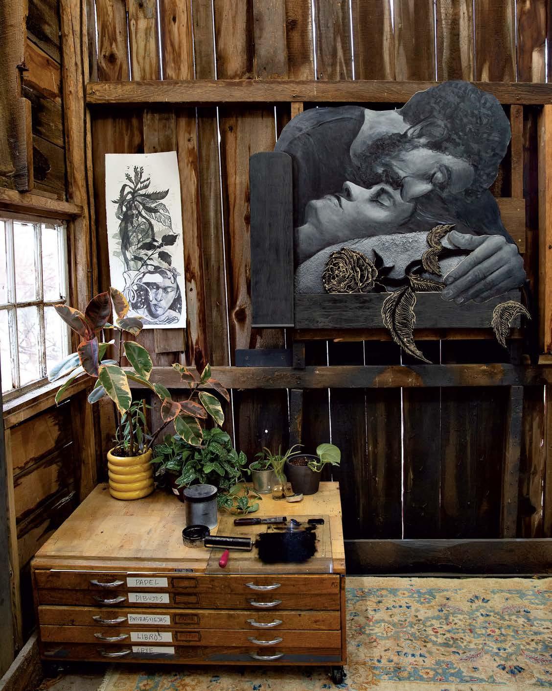 Artist Luján Pérez Hernández’s cat, Lil’ Mustache, keeps her company in the studio (opposite). Finished pieces, works in progress and treasured mementos color the 1800s barn (this page).