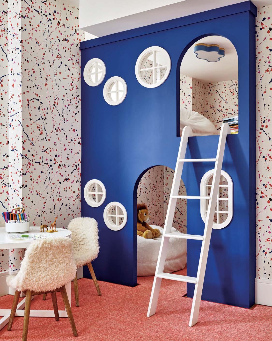 Opposite: A vinyl Chilewich floor covering and Porter Teleo for Schumacher wallpaper wrap the playroom, where a custom-built playhouse is painted Sherwin-Williams’ Blueblood. The table and chairs are RH Baby & Child.