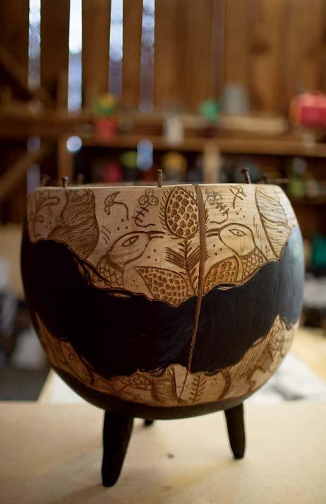 Last spring, Pérez Hernández moved to Old Chatham, where she now lives full time while commuting to the city to teach at the New York Academy of Art. Not content with solely producing woodcut prints (like her ethereal works on paper created with signature handmade inks), she’s expanded her practice to encompass wall sculptures made from birch plywood and standalone, vessellike pieces carved from fallen trees found on her property. “Since moving up here, I’ve been in a transitional moment,” she says, “and I’m starting to incorporate materials from my life—like finding original flooring nails from the early 1800s in the house we’re renovating and conceptualizing what those materials can be for the story I’m telling in a piece.”