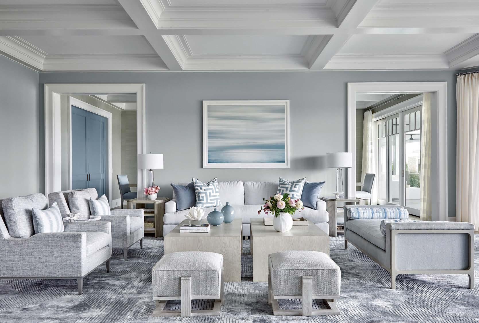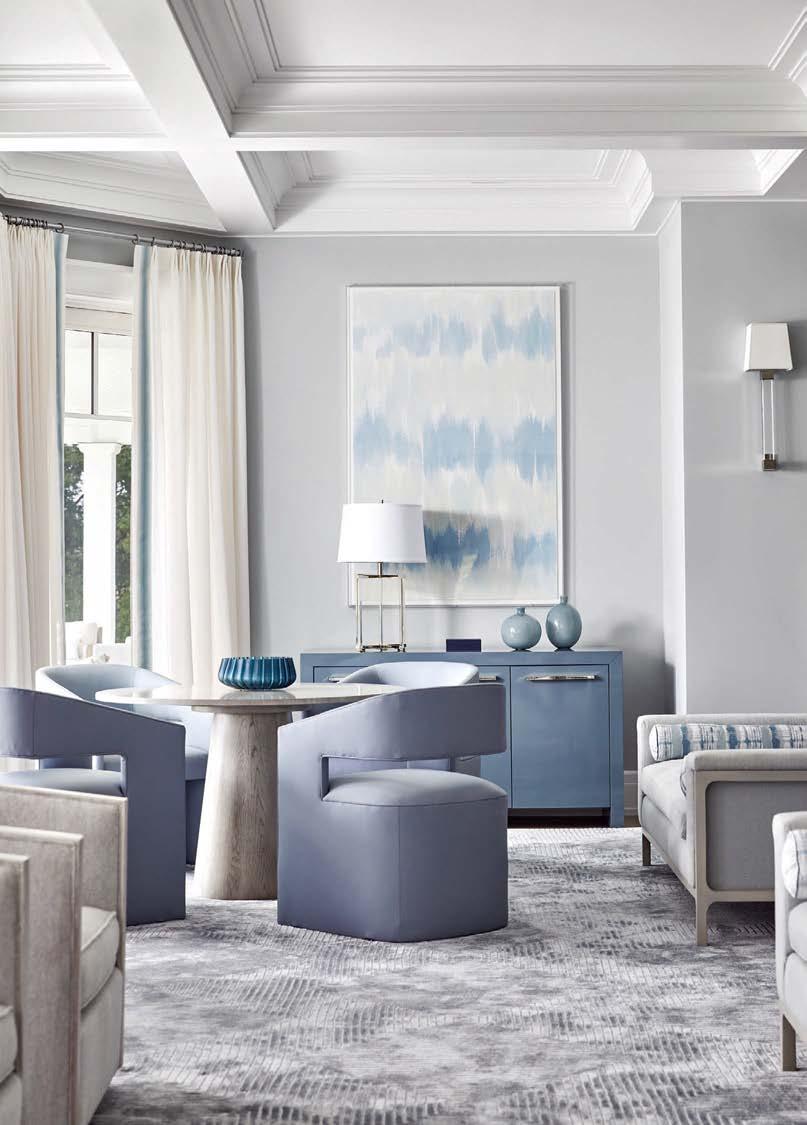 When it came to decorating the space, “modern organic” is a phrase that frequently came to mind for the team, inspired in part by the fine artworks they sourced early in the design process. Take the compelling paintings of tree bark and xylem by artist Kristin Leachman in the family room, around which the designers devised an earthy palette, pulling taupes, steely grays and pale pinks for the luxe mix of fabrics. Similarly, the dining room’s impressive Stanley Boxer work in shades of lilac informed the shimmering purplegrays of the chair upholstery—and the hints of soft lavender that thread through the decorative accents in the adjacent formal living room.