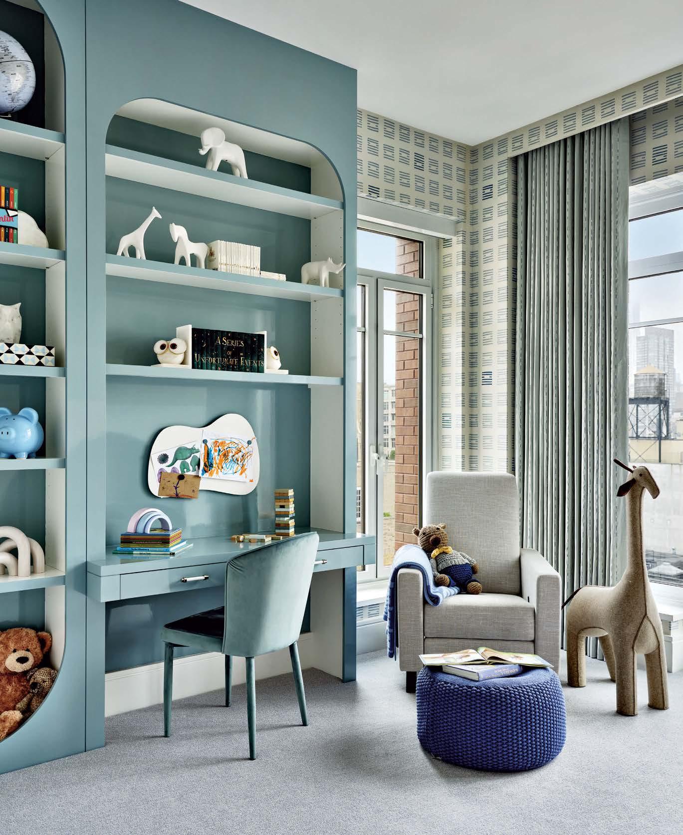Opposite: The built-in desk with shelving was fabricated by Structure NYC and given a high-gloss coat of Benjamin Moore’s Early Morning, paired with a color-matched Tov Furniture chair. Drapes of Larsen fabric layer in another soft blue hue.