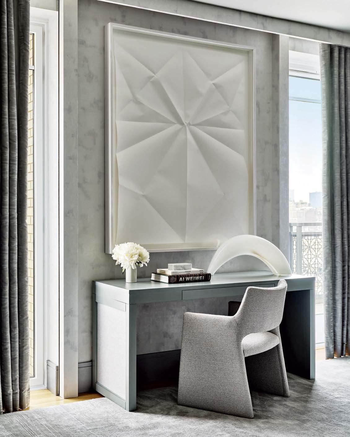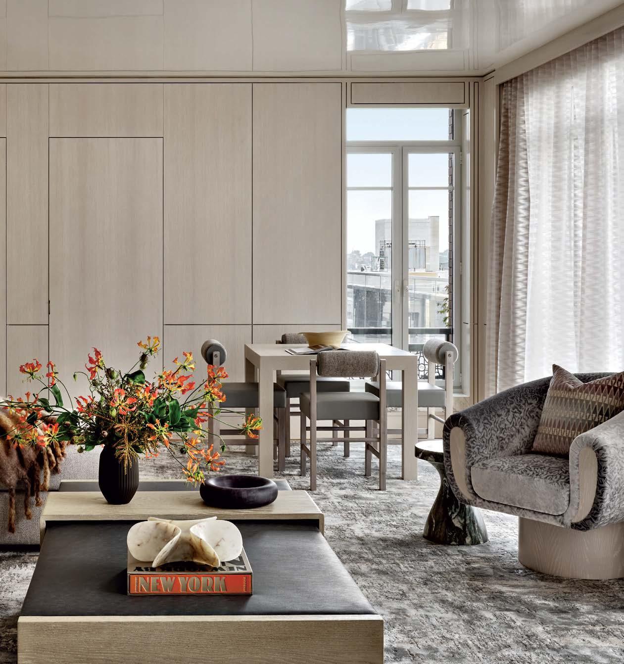 In the newly carved-out family room, floorto-ceiling white oak wraps the walls, creating a nuanced canvas that encompasses hidden storage at one end of the space and a built-in media center at the other. To define the latter, the designers cleverly recessed the television in reeded oak paneling. Gleaming above, a highgloss ceiling makes a wow-worthy statement that, depending on the light, mirrors the movement of the Hudson River on view through the room’s vast expanse of windows. “In the evening, with the reflections, it changes the whole mood of the room,” Mabley shares. Harnessing the decorative treatment’s luminous capacities, the glossy ceiling treatment reappears in the living, dining and primary bedroom, while textured oak paneling and marble interjections repeat boldly at the elevator entry and as accents elsewhere. Crucial to the continuity of these material through lines was Capolino’s in-house