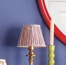 Above: Stark carpeting creates a creamy base in another child’s bedroom. Colorful counterparts are provided by a Stray Dog Designs chandelier, a built-in desk with backing in Benjamin Moore’s Victorian Purple, a Savannah Hayes wallpaper and drapes of Clarke & Clarke fabric.