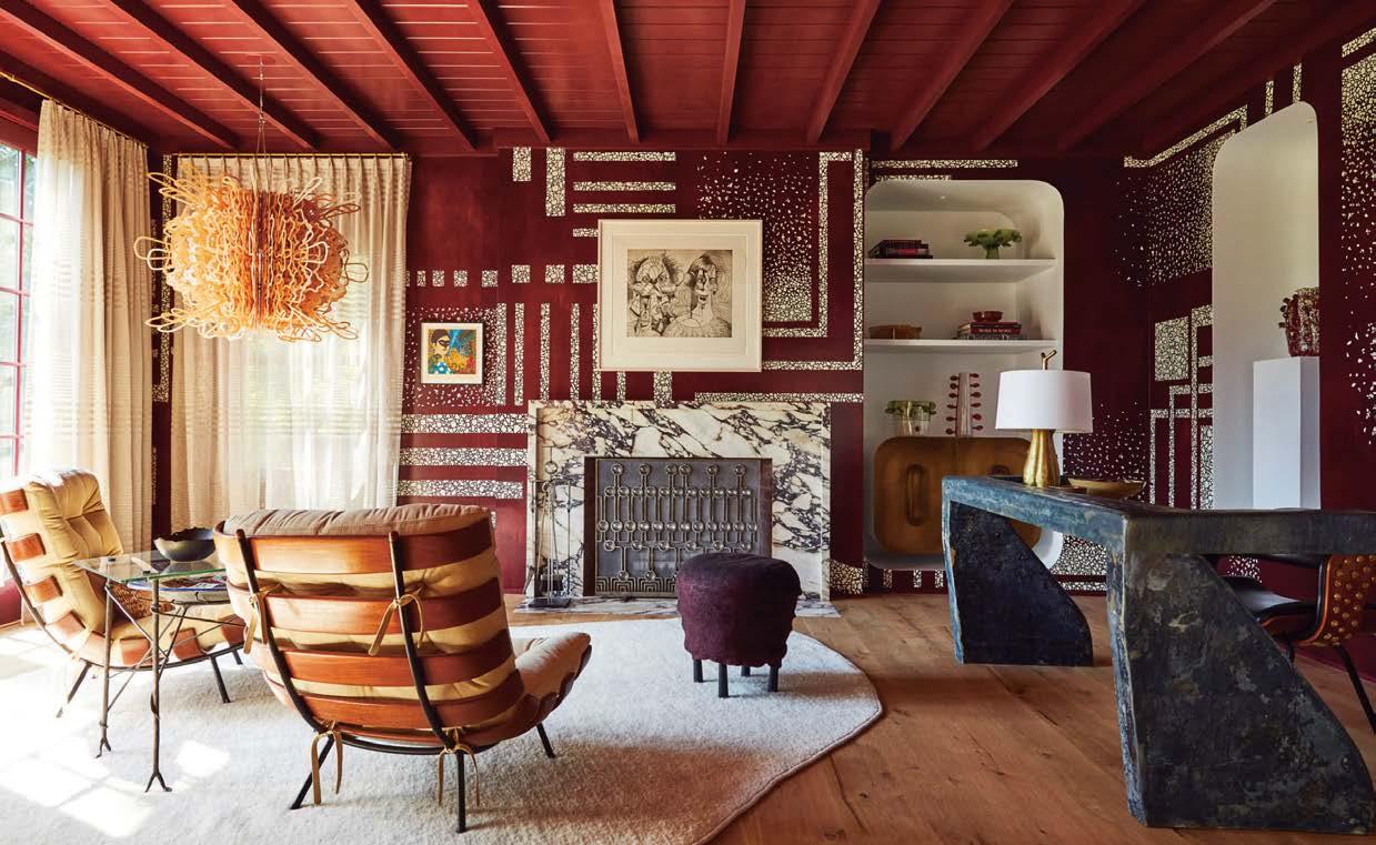 Above: Another living room moment is composed of a 1940s burl-wood chest by Gilbert Rohde from Glen Leroux Antiques crowned by an abstract painting. An armchair sourced from Greenwich Living Design offers a spot for repose.