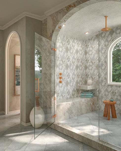 Above: The primary bathroom is wrapped in a mix of finishes, including Porcelanosa shower wall tiles and marble mosaic floor tile from TileBar. The cabinetry hardware is by LuxHoldUps and the faucet is Kallista. A Kohler bathtub stands inside the shower.